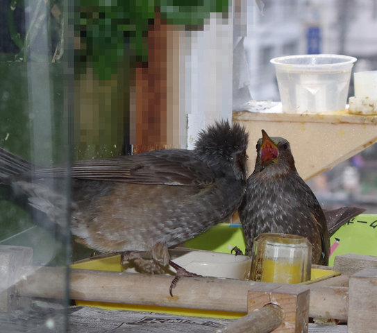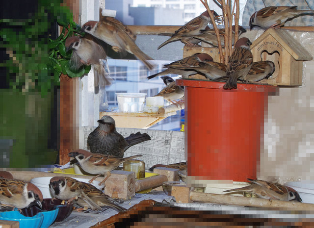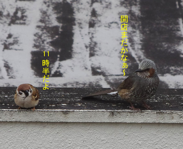 2019年03月20日 3月20日 暖かくなる スズメ達も警戒はしているようです…が、すぐ忘れちゃうからね~。猛禽に部屋の中に飛び込まれても障害物があれば助かることもあるでしょうとこんな物を置いてみたりしました。スズメ達は環境が変わると用心してしばらくは近づきませんが食べ物につられて慣れてきます。今日は20度を越すような暖かい日になりました。ヒヨドリは花の蜜でくちばしはまっ黄黄です。早咲きのヒカン桜が満開ですからね。フンが紫色なのは紫の木の実を食べてきたのでしょう。草食派ですからね、でも夏にはセミを食べたりしますけどね。スズメ達は喉が渇くのか水を何度も飲みに来ます。おやつのカステラうれしいようですね。スズメ達にもカステラ投げはあります。