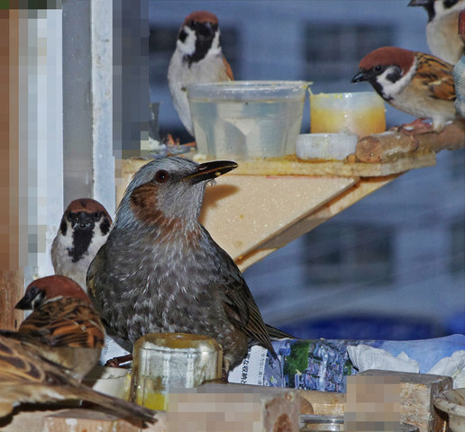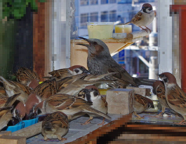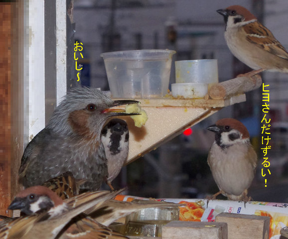 スズメ達は30分ほどは見かけませんでしたが、その後ケロッとして食事していました。誰かがいなくなったのに、この神経が君達を生き延びさせているのだろうね。