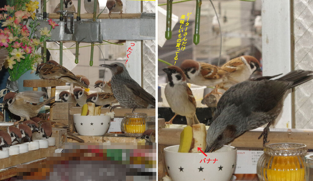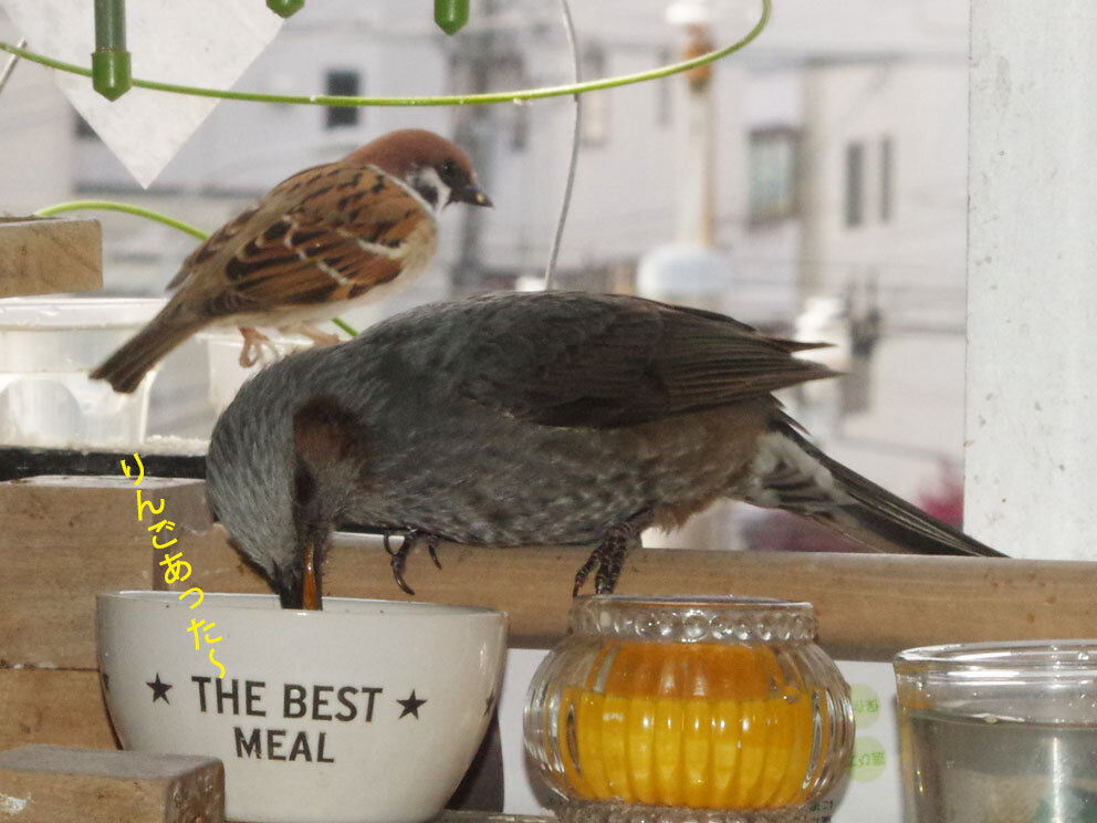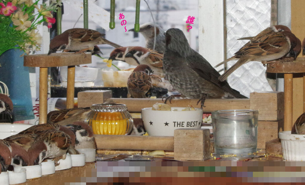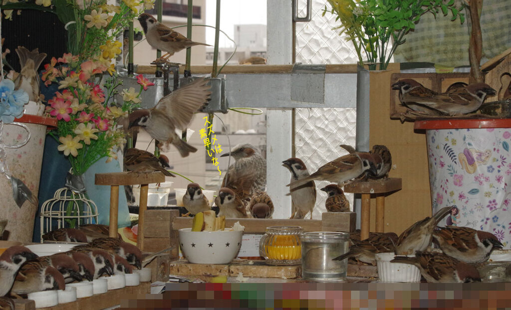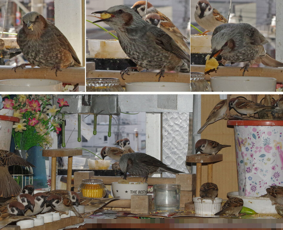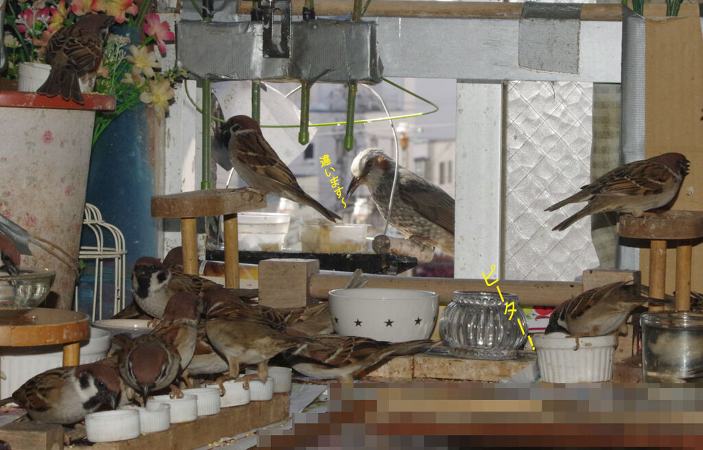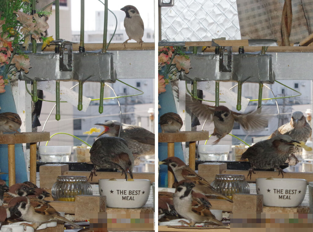 お昼のランチはスズメ達の行動予定に入っています。去年はいつまで待っても窓が開かなかったね、ひもじい思いさせてごめんね。