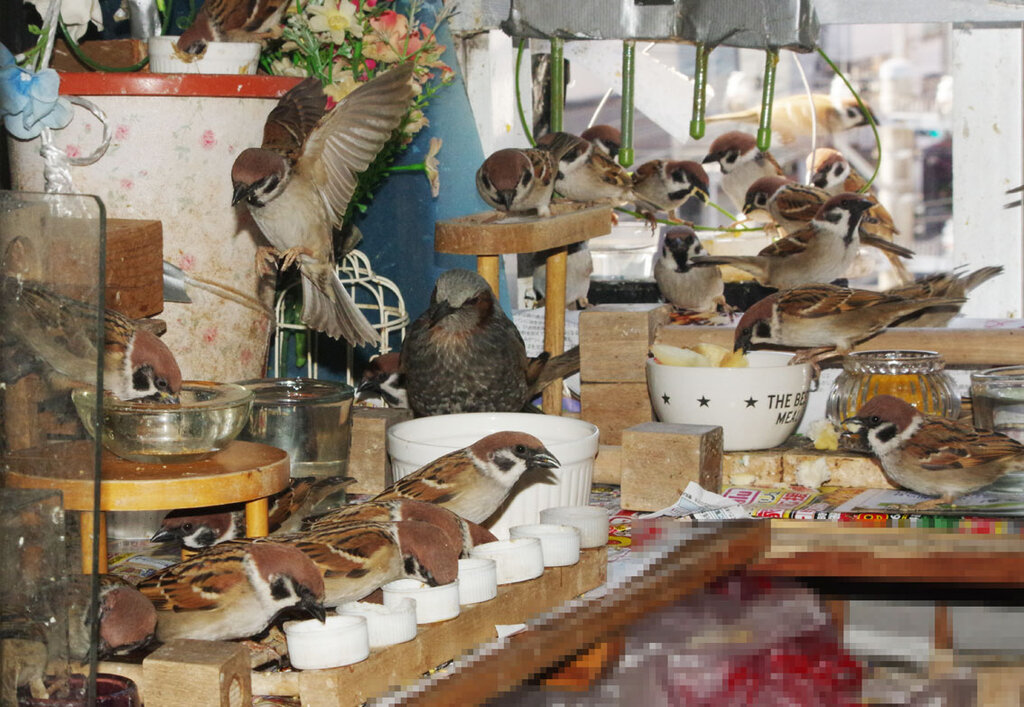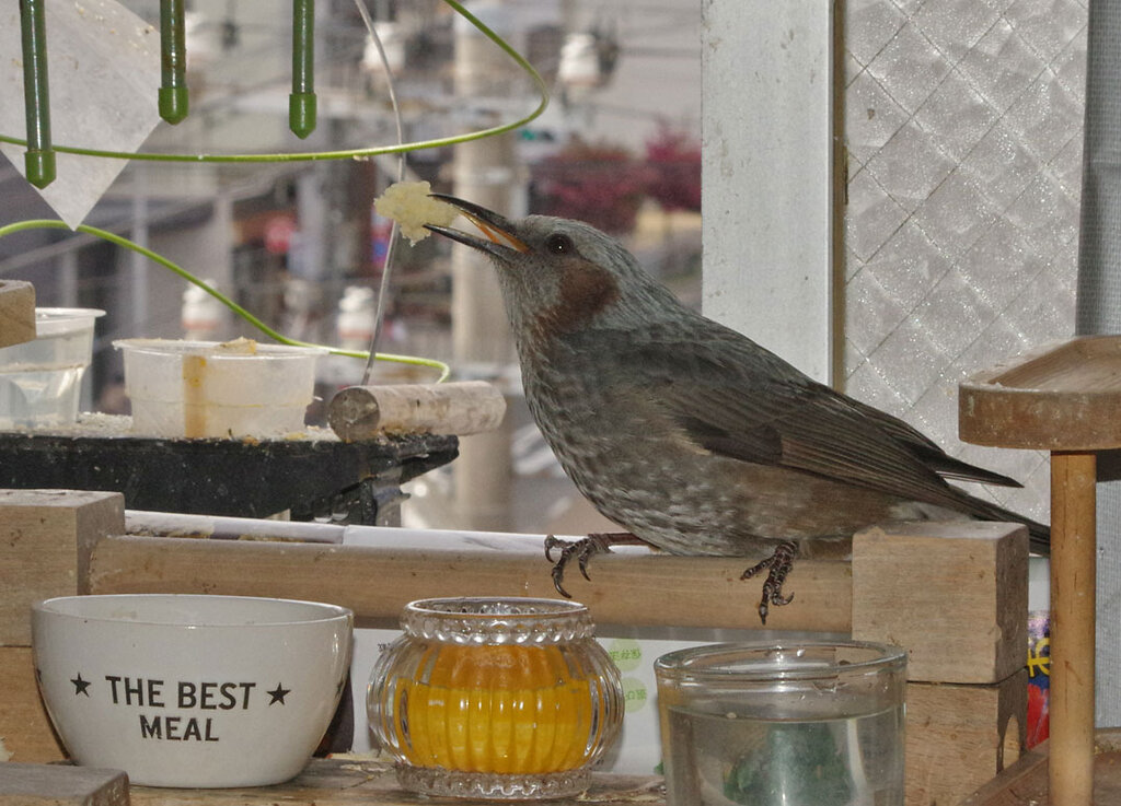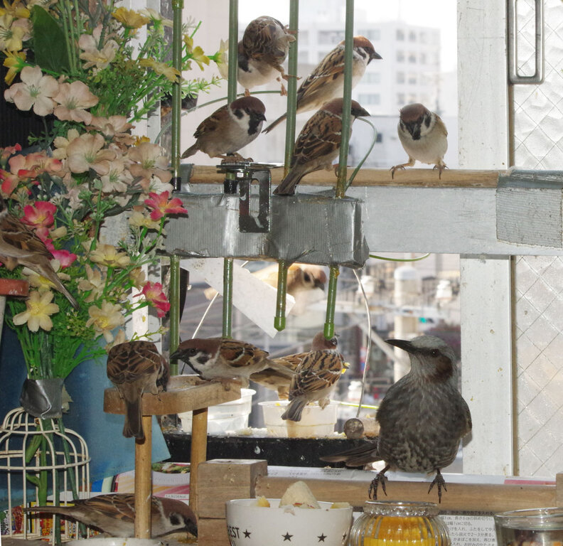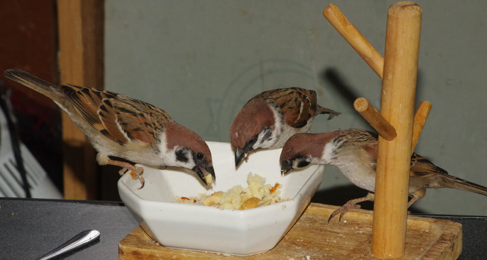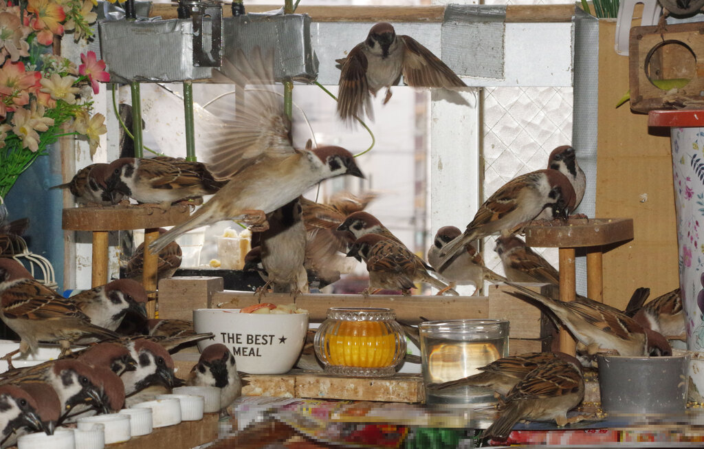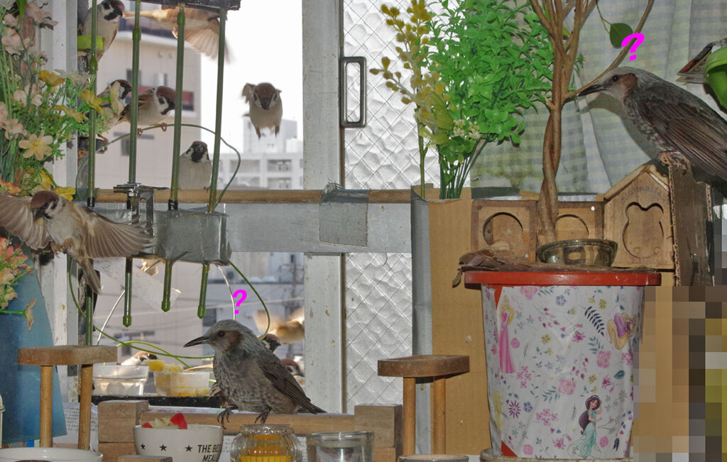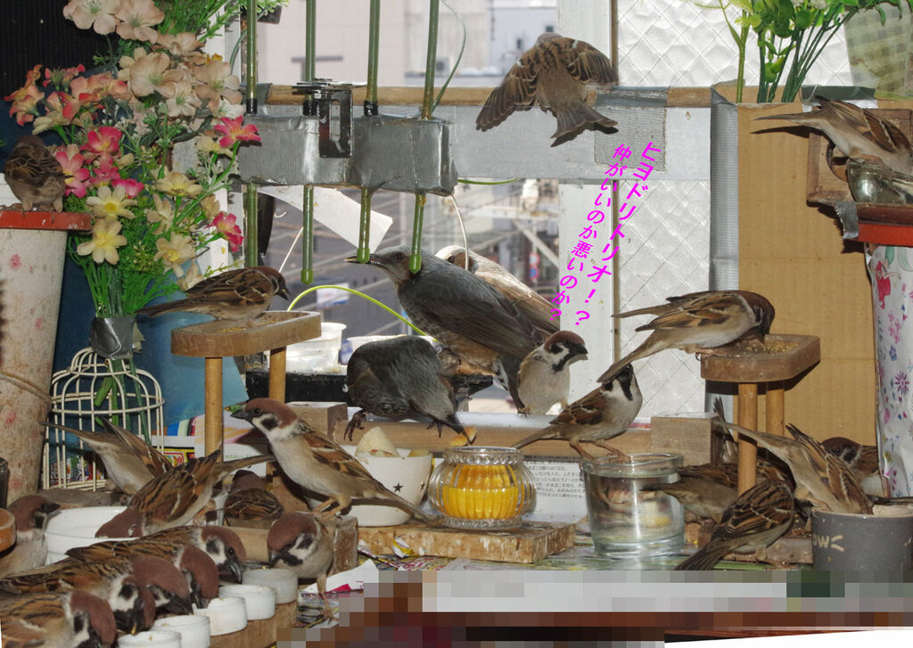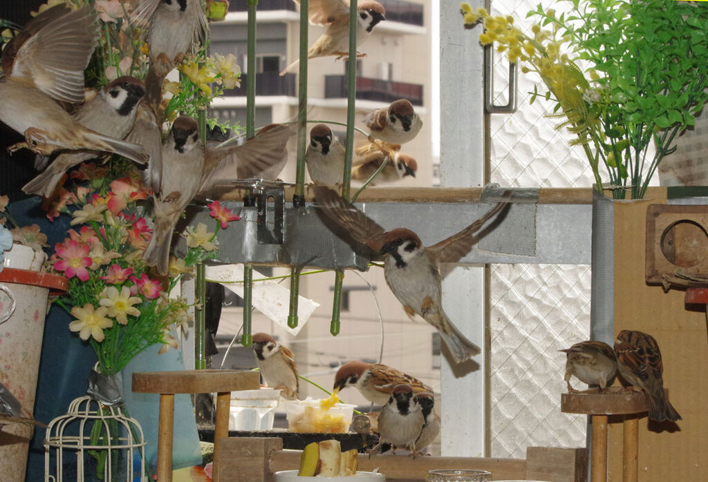 お昼のランチはスズメ達の行動予定に入っています。去年はいつまで待っても窓が開かなかったね、ひもじい思いさせてごめんね。