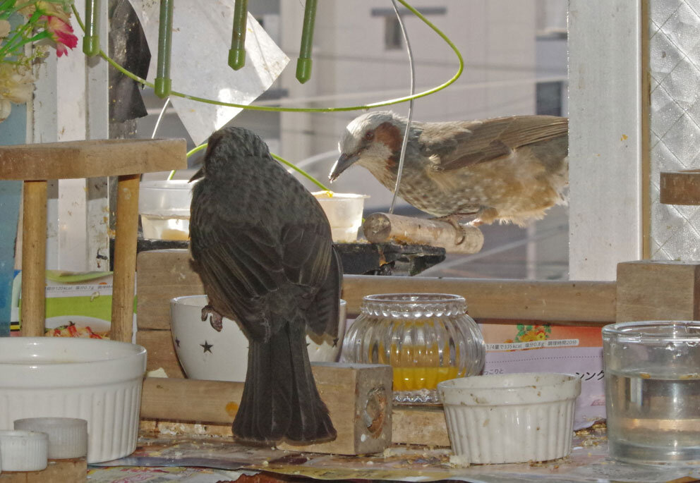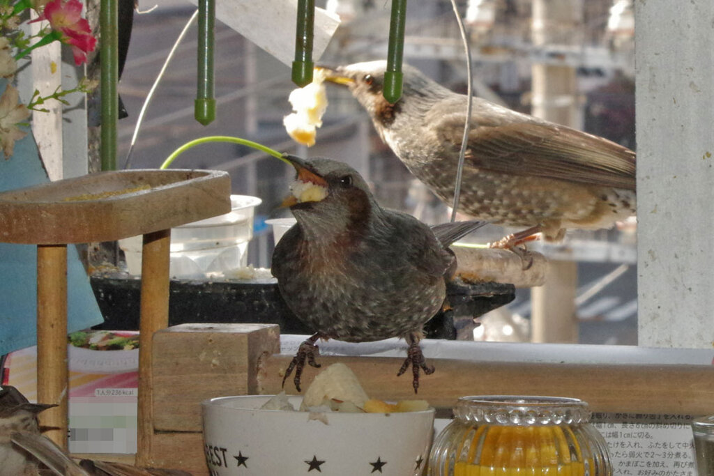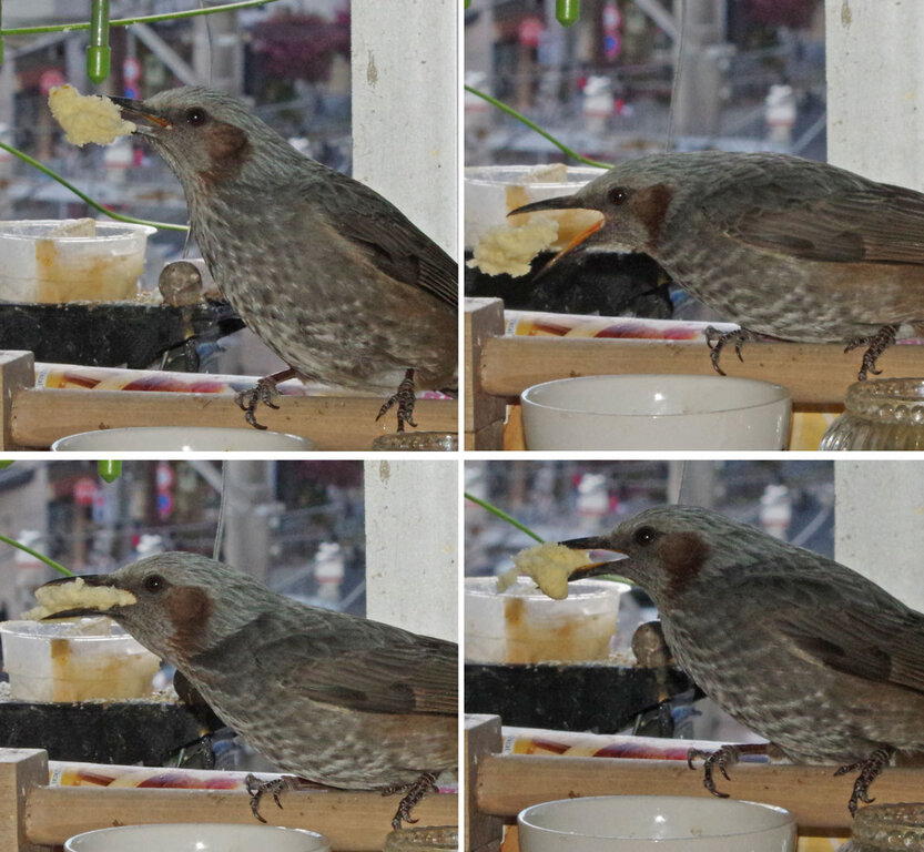 追加!3月30日朝6時半に窓を開けるとイソッペ君がお代わりを待っています。パンを追加するとヒヨドリと牽制しあいながら食べています。ここに居てくれて嬉しいけど彼女は見つかりそうもないね~