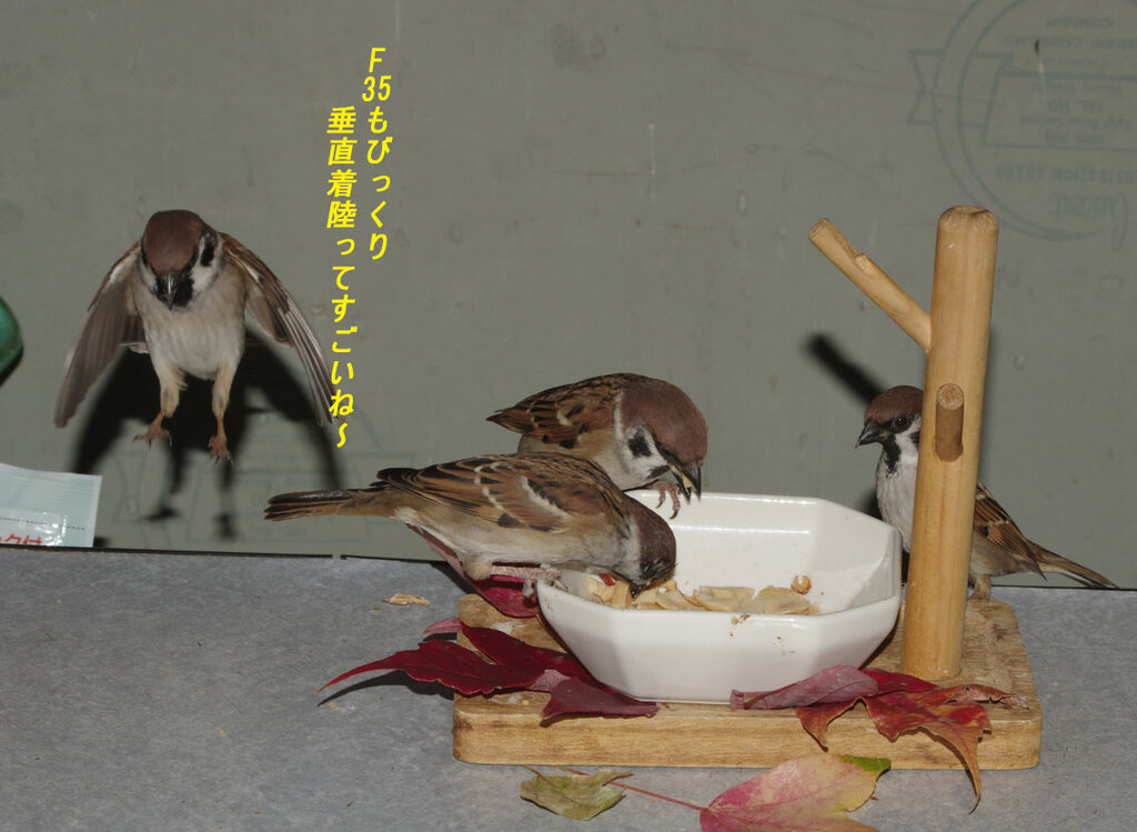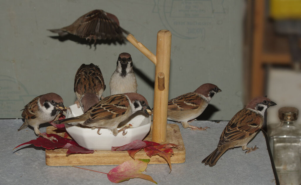 散っていたスズメたちは戻って来ると警戒はするものの食事を続けます。嫌なことを忘れないと生きていけないもんね~。