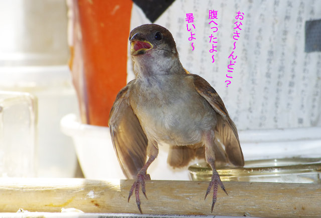 巣立ちヒナちゃんは三重苦で大変ですね。ウンウン! スズメは辛抱だー!