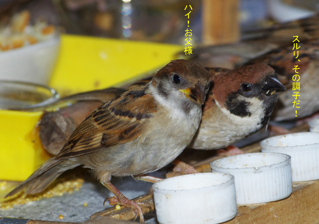 ▽チビさん達に米粒をあげてみた、モグモグと時間がかかるが美味しいらしい。秋になったら田んぼまで遠征して「虫捕りにきましたぁ~」とかとぼけて新米を食べに行くのを知ってるよ。米が硬くなる前のやわらかいとこをチュッとくわえて吸うとうまいからね~。あんまり食べると害鳥だ!と嫌われるから虫をたくさん取ってね~。