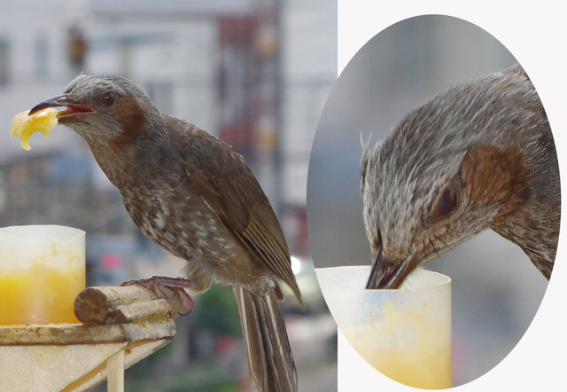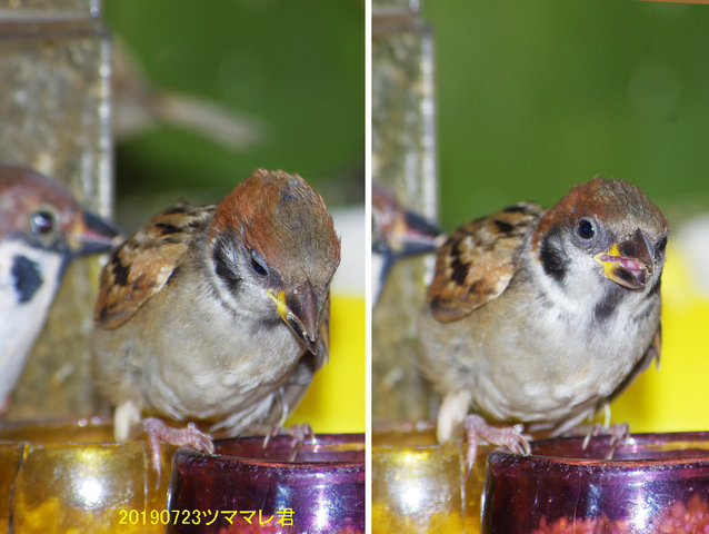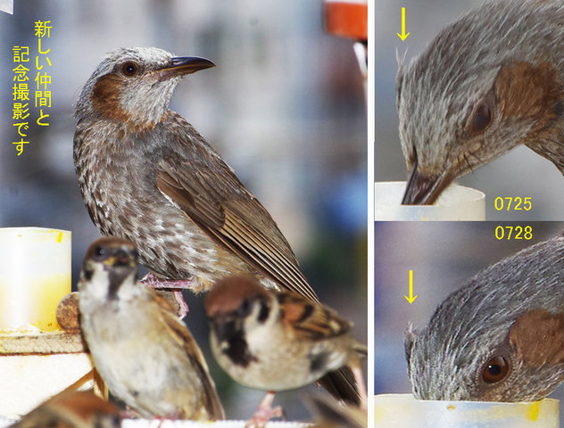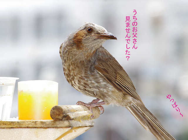 7月25日に親子で来たヒヨドリ。ピーターのグループではないようで28日に子供だけジュースを飲みに来る。