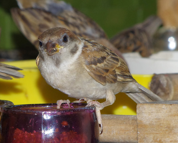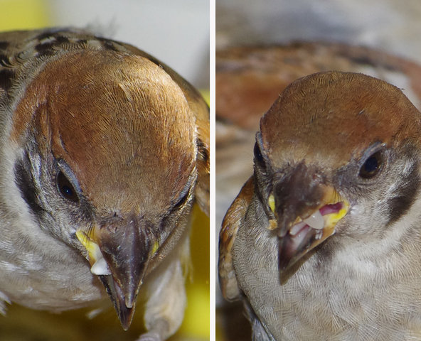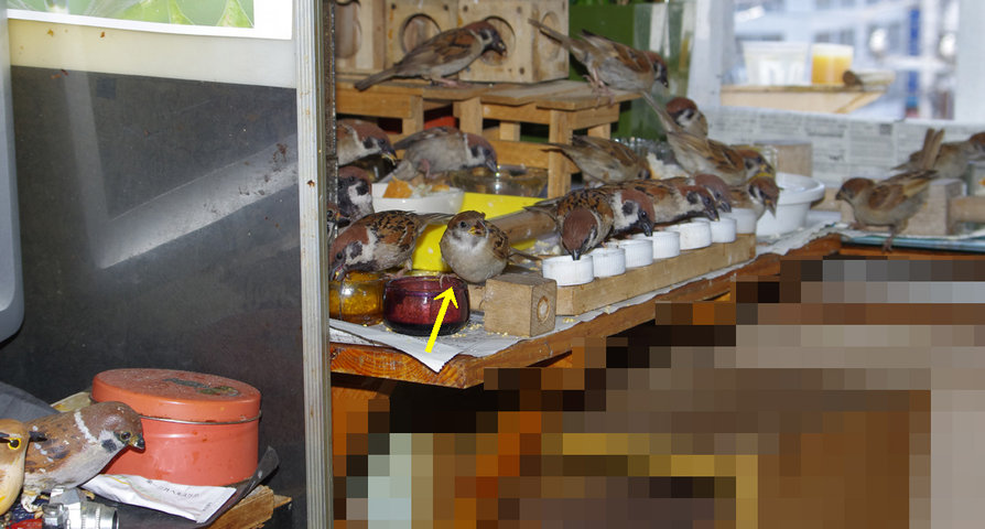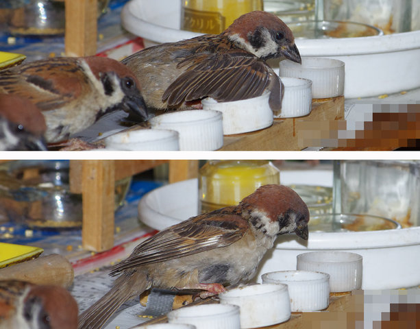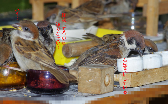 しばらく前から気になっていた右足が折れたらしい大人。捕まえて添え木をしてやろうと試みたが警戒して逃げてしまうので「もう捕まえないよ」と見守るだけ。翼を松葉杖みたいにしてエサを食べている。みんななんとなく場所を譲っているようだ。気がつかない子供は注意されるね。自然治癒しか方法はないけど、みんな治ってきたからね。コピー君など片足がブラブラで見ていられないほどだったがなんとか治りました。足に響かないようにとまり木は柔らかいバルサ材で作ったりするのが精一杯でした。野生の皆さん頑張ってね~。