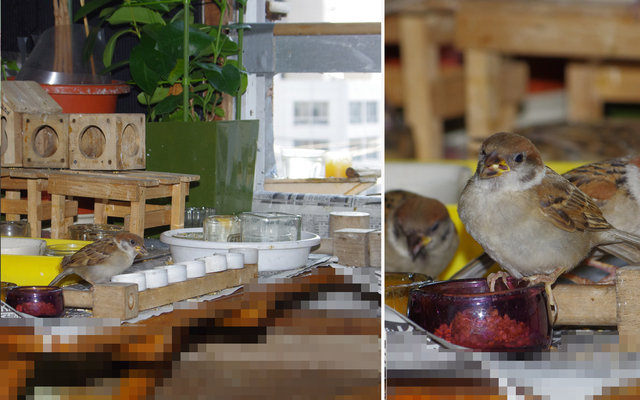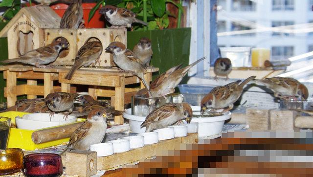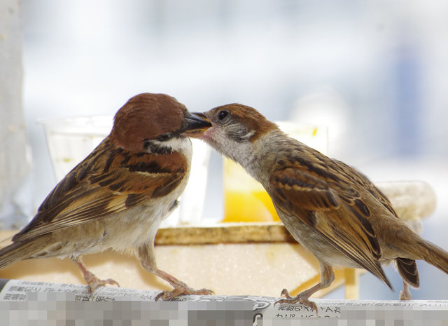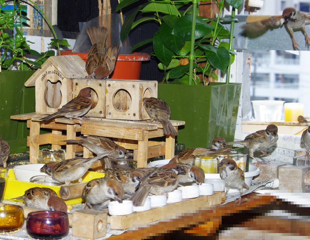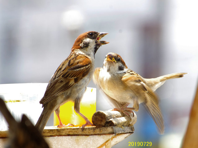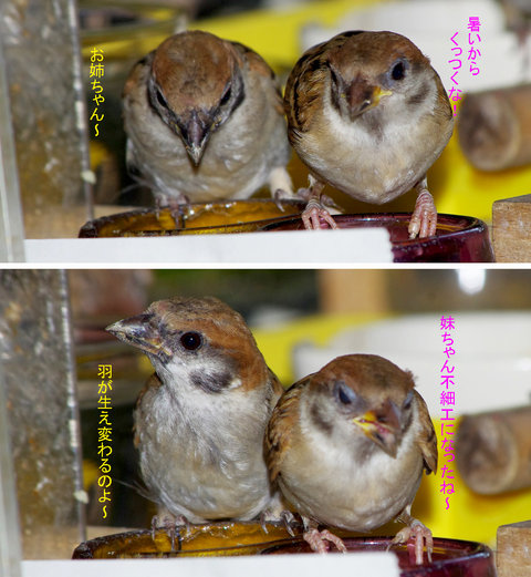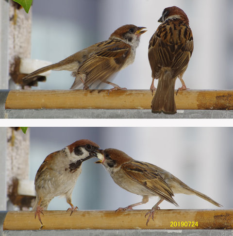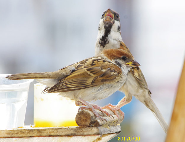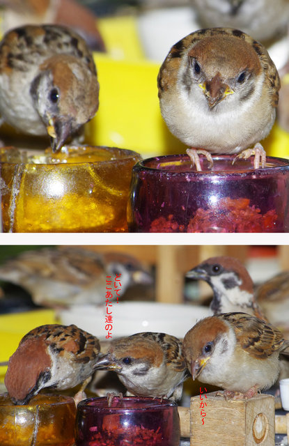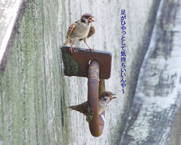 △29日の子。とにかく暑い!スズメ達も口を開けて羽を広げで耐えている。