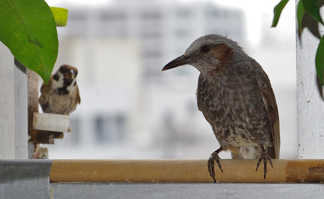 その後に異変!「ヒーヒー」と泣きながらチビヒヨさんが来る、その後ろには親の姿。ジュースの中に入れてあったパンを食べる。親は目が合ったら逃げたのでピーターやニバンではない。お母さん??それともボスが旅に出たのを見て子供を連れてきたのだろうか?向かいのビル縁で体を震わせている子供と親がいたがカメラを向けたときは逃げていた。旅に出る時期なのに今頃巣立ちとはね~。知っているつもりでも野鳥の世界は奥が深いな…。