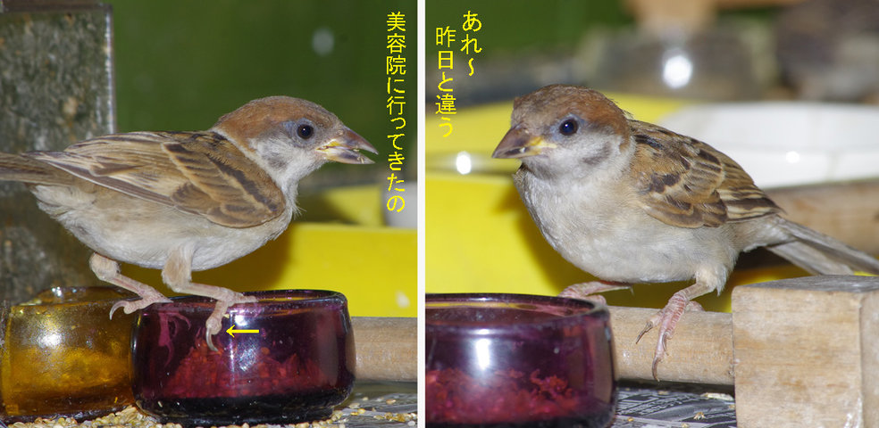 ▽足の折れた大人スズメは昨日よりいくらか動けるようになったような気がする。なんとか完治してね。