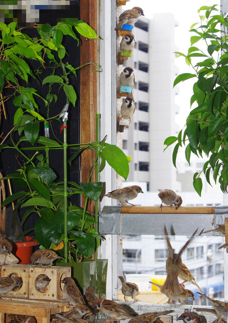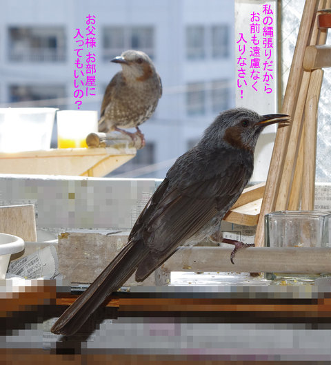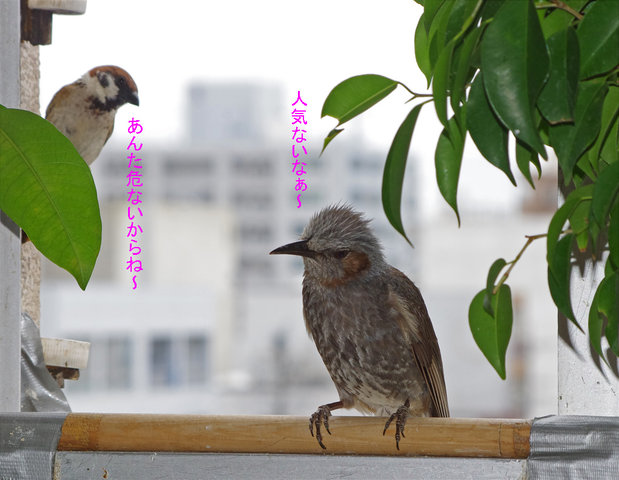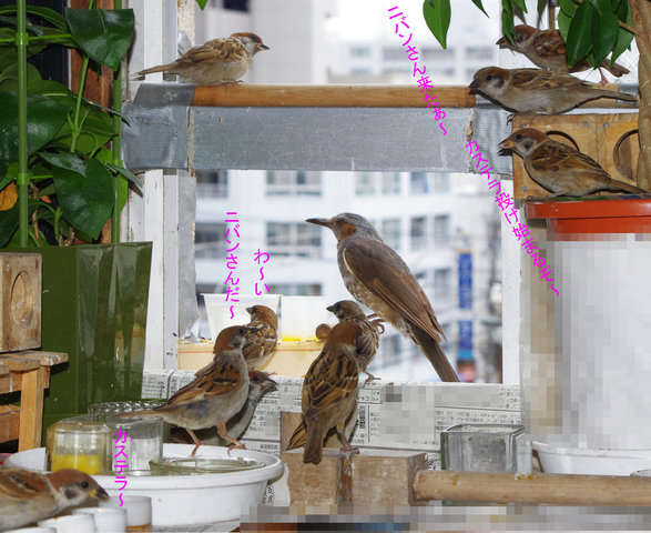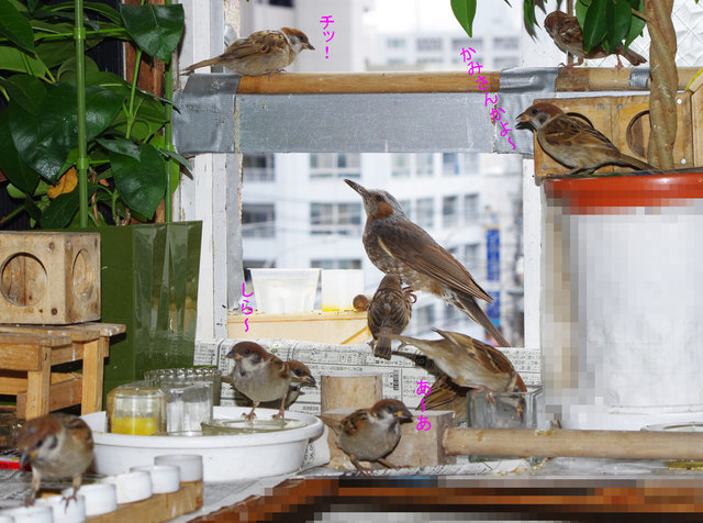 黒助ちゃんはだいじょうぶか~。 「疥癬=ダニが原因の皮膚病。スズメだけでなくヒヨドリもかかる。巣の使いまわしなど不潔にすると発祥する。鳥の場合に効くのが特効薬のオイラックス。毎年これで治ります」…スズちゃんもヒヨちゃんも清潔にね~。