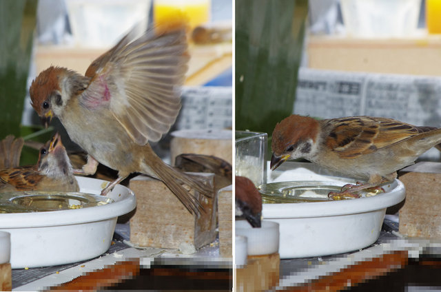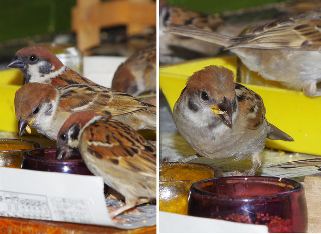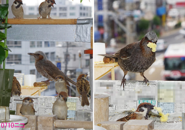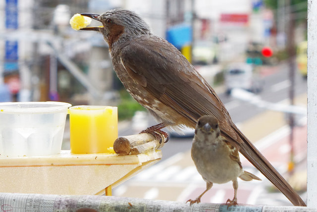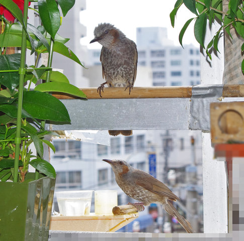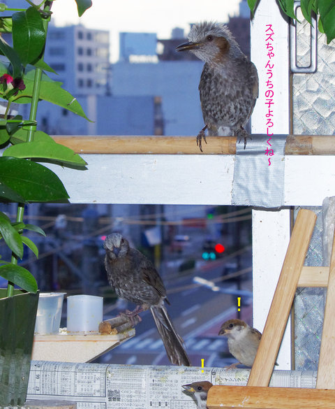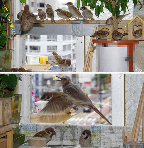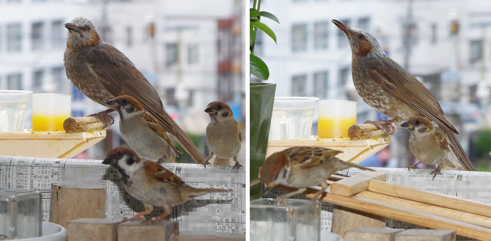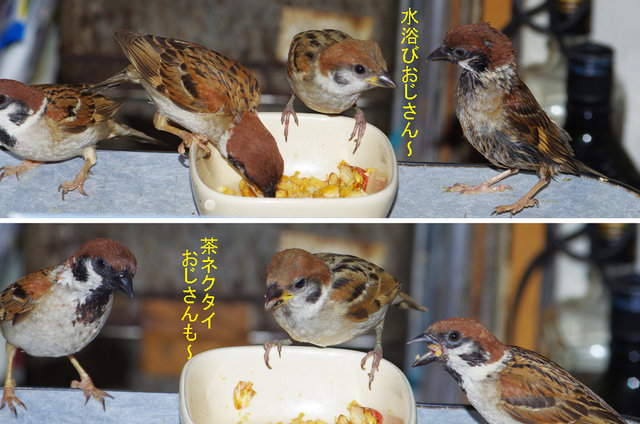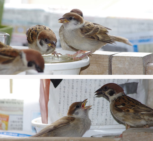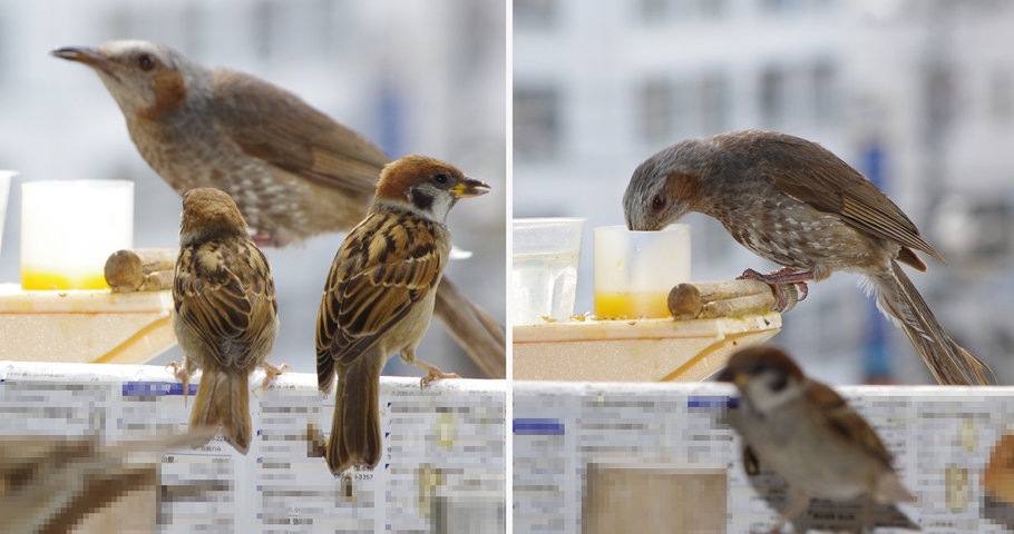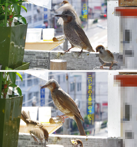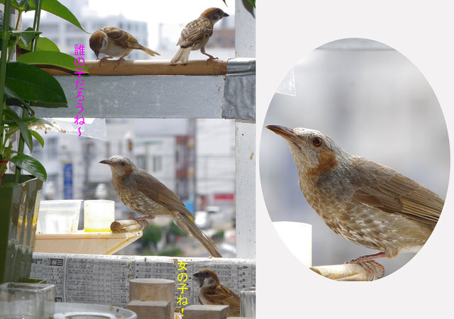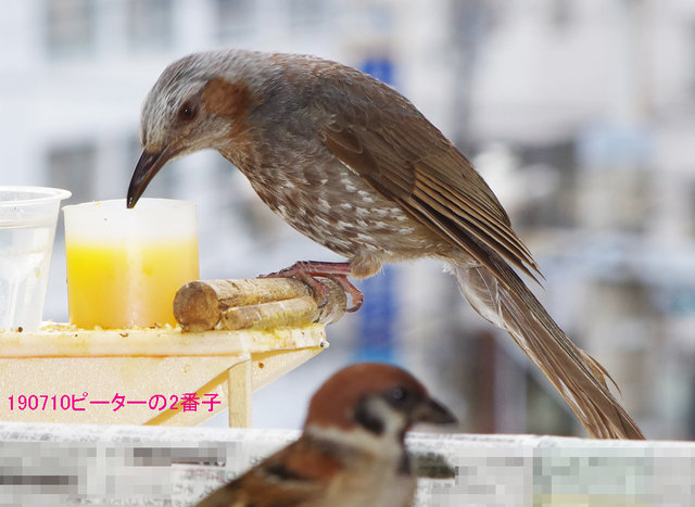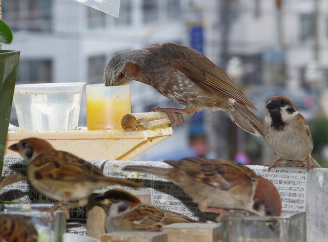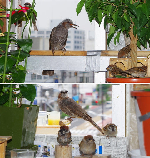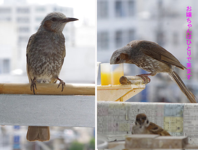 ヒヨドリのピーターとニバンが娘を紹介しました。若い子がひとりで来てジュースを飲んでいます。スズメ達も誰の子だろうと興味ありそうです。