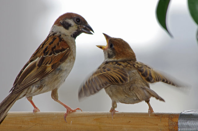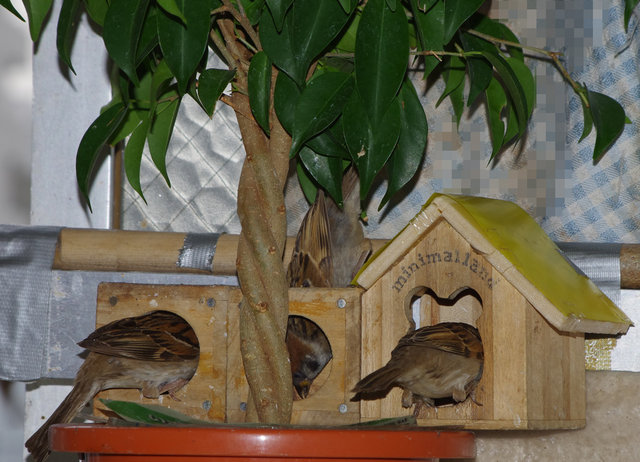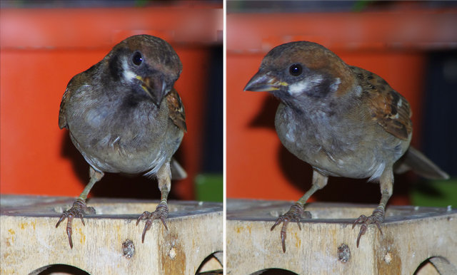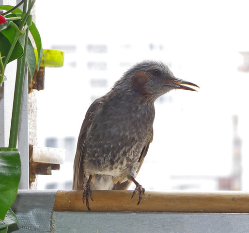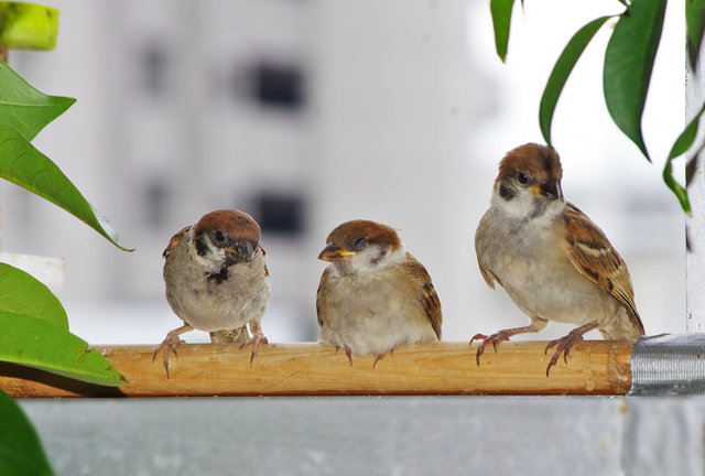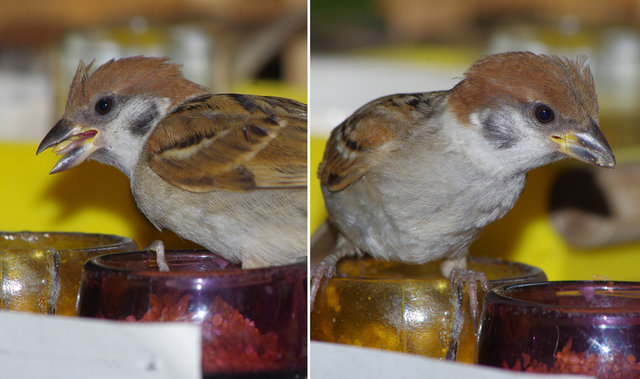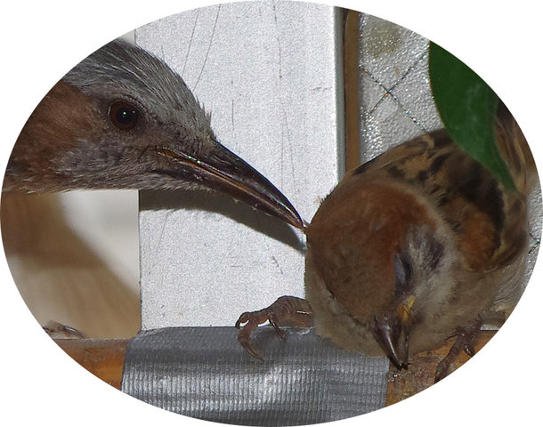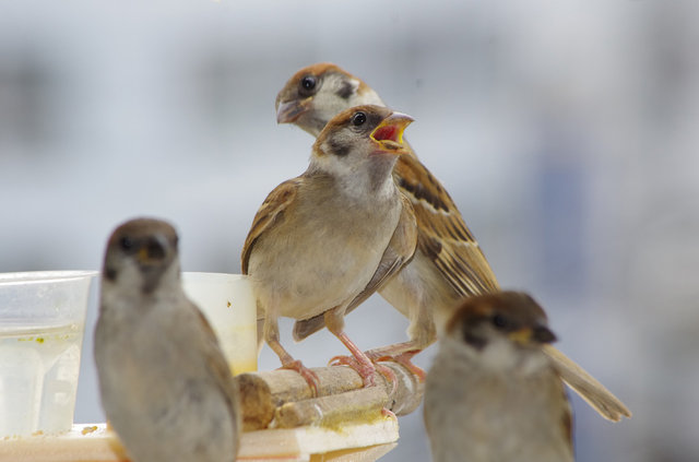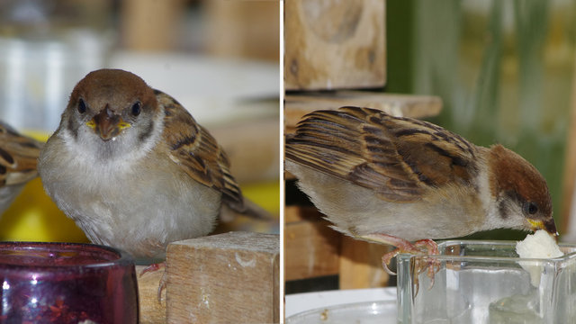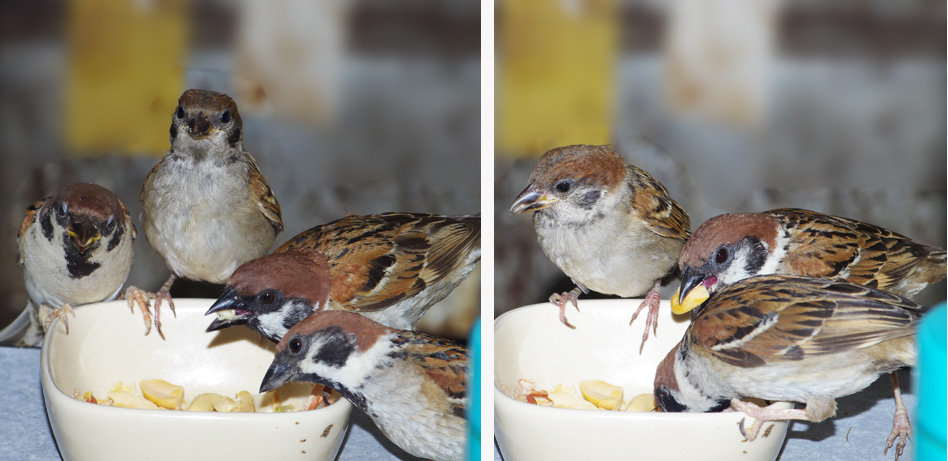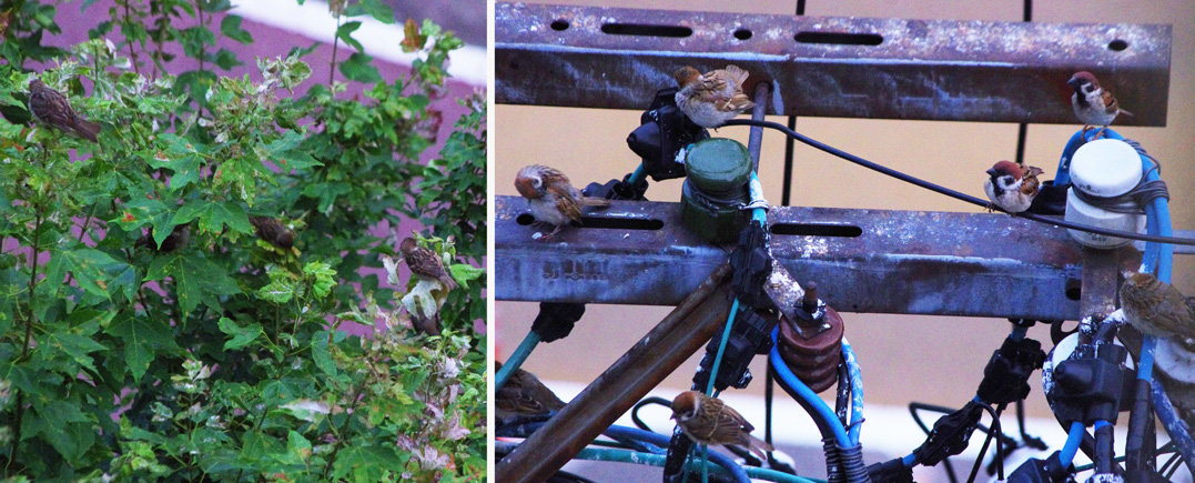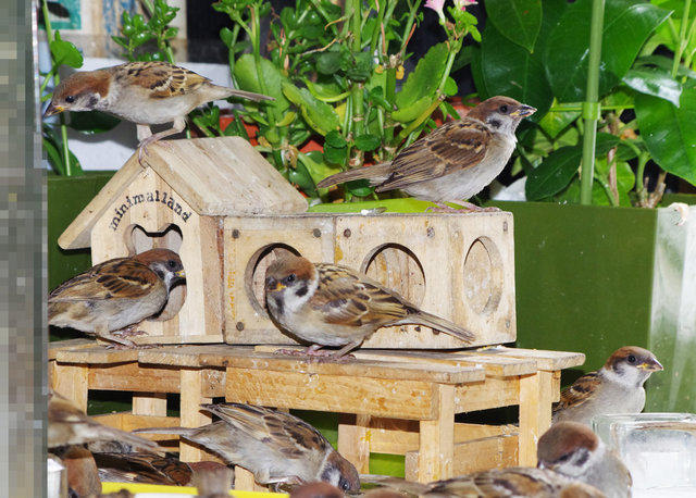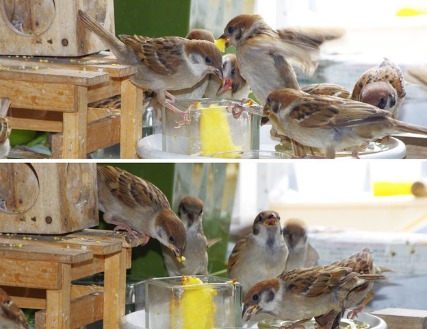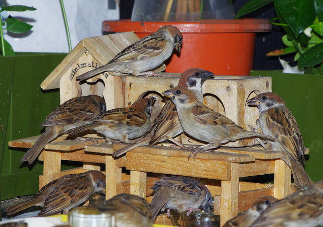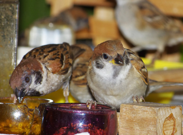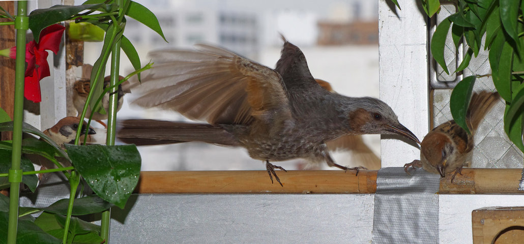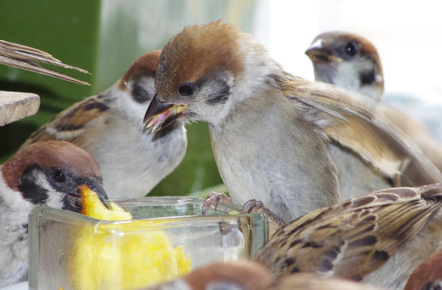 ヒヨドリのピーターとニバンが娘を紹介しました。若い子がひとりで来てジュースを飲んでいます。スズメ達も誰の子だろうと興味ありそうです。