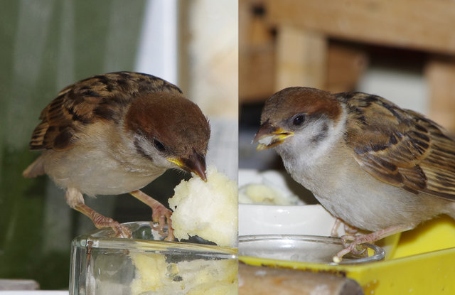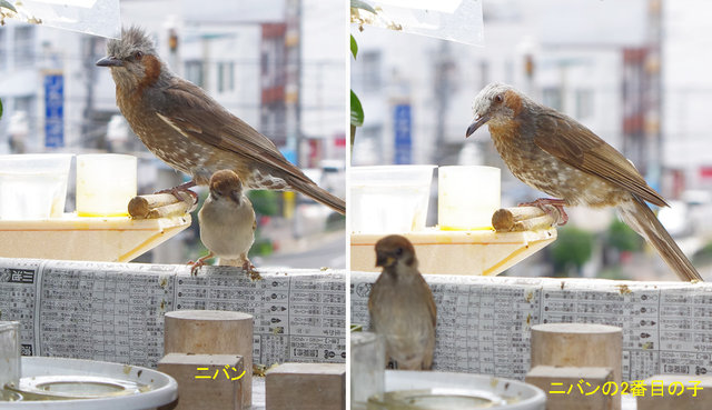 午後にニバン君も来る。いつものようにスズメと奪い合うようにカステラを拾って食べて飛び立ったら…若いというより幼い感じの娘が来る。この子はニバン君の2番目の子供みたいです。