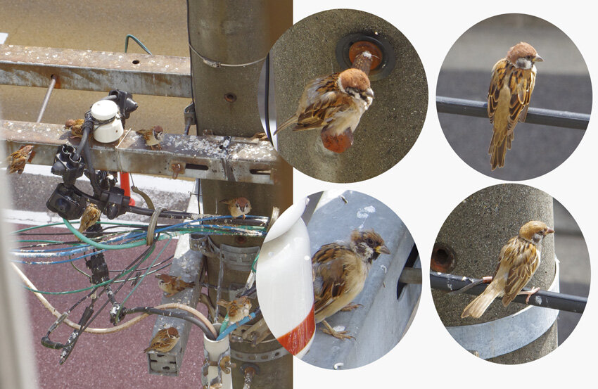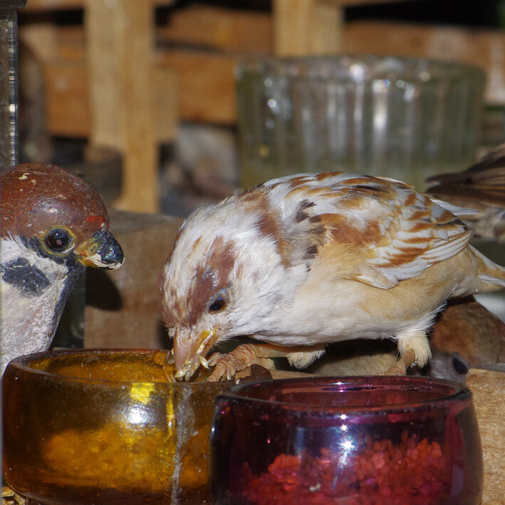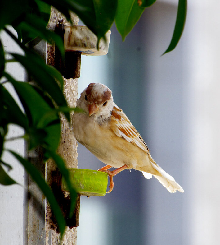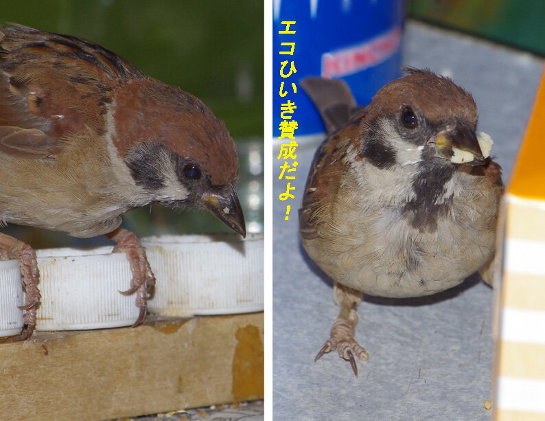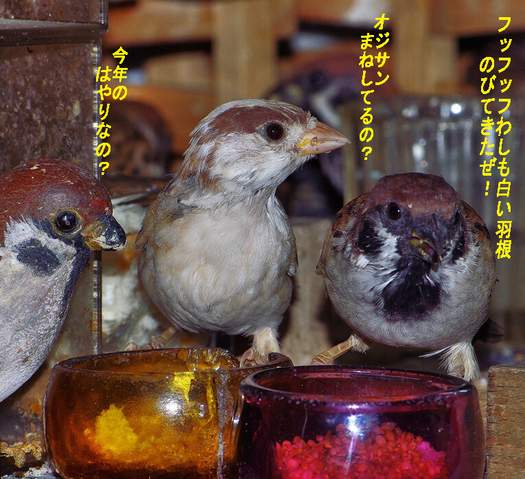 白くなりそうなスズメのブッチーはここに来てから丁度一か月になりました。河川敷なんかで集団で食べている時に人が来たりして一斉に飛び立つたりしたのが別の集団だったのかもね。
