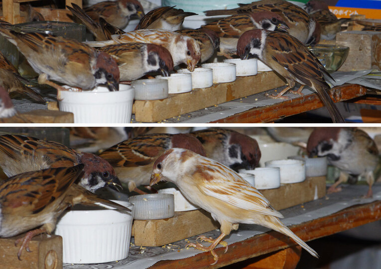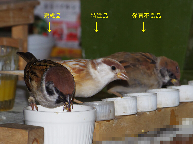 夏ヒナ最終便の3羽はどうも成長が遅れています。大人と比べるとこんなに差がある。ブッチーは8月末に仲間になった時はもう少し大きかったかな。
