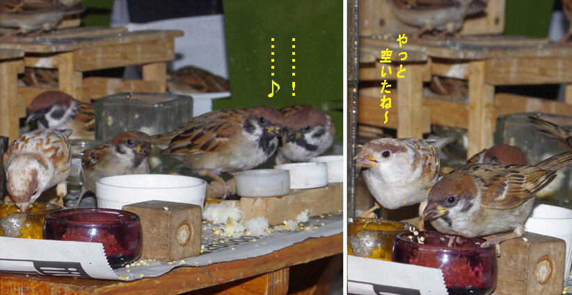 今日は外出していてスズさん達たちのお昼御飯が遅くなりました。待ちかねたように飛び込んできて場所取り合戦。