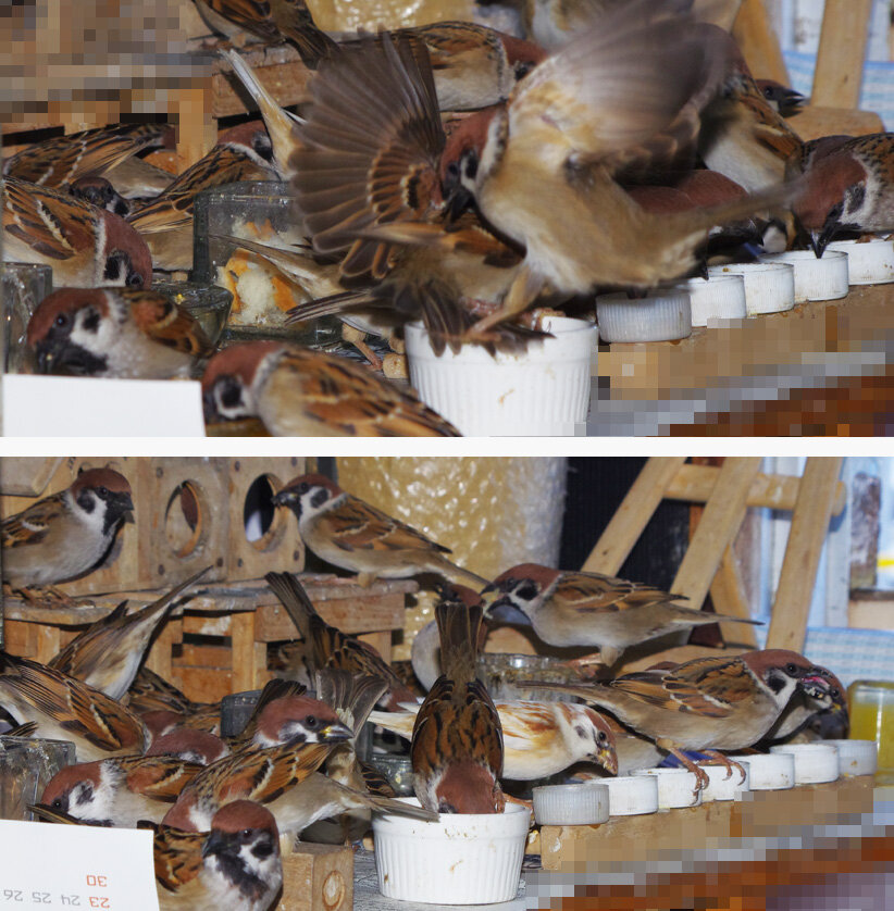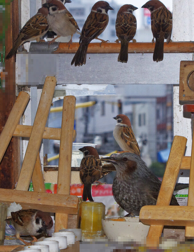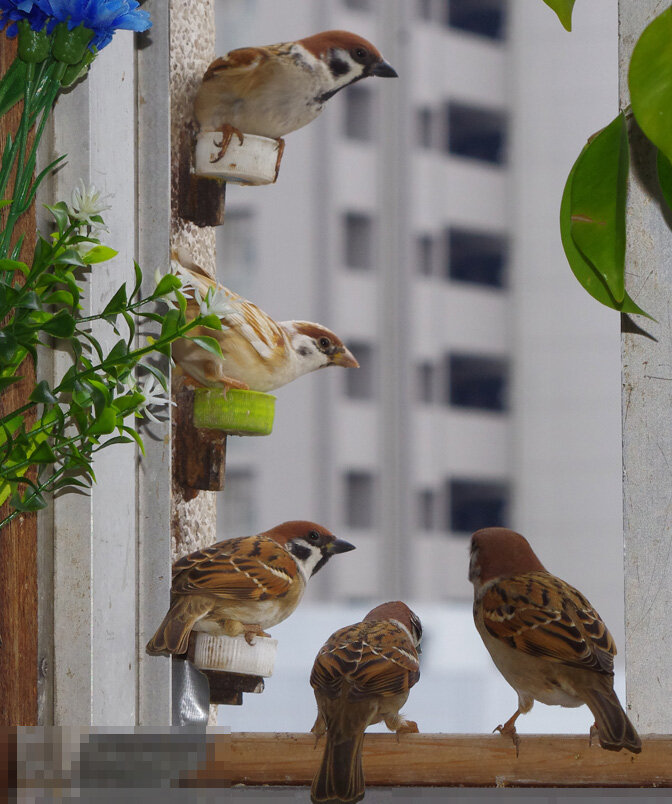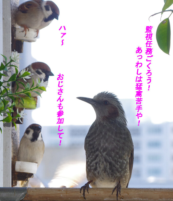 窓枠の上の段はヒヨドリではボスしか乗ってはいけないルールがあるようだ。スズメ達は全然かまわないけどね。
