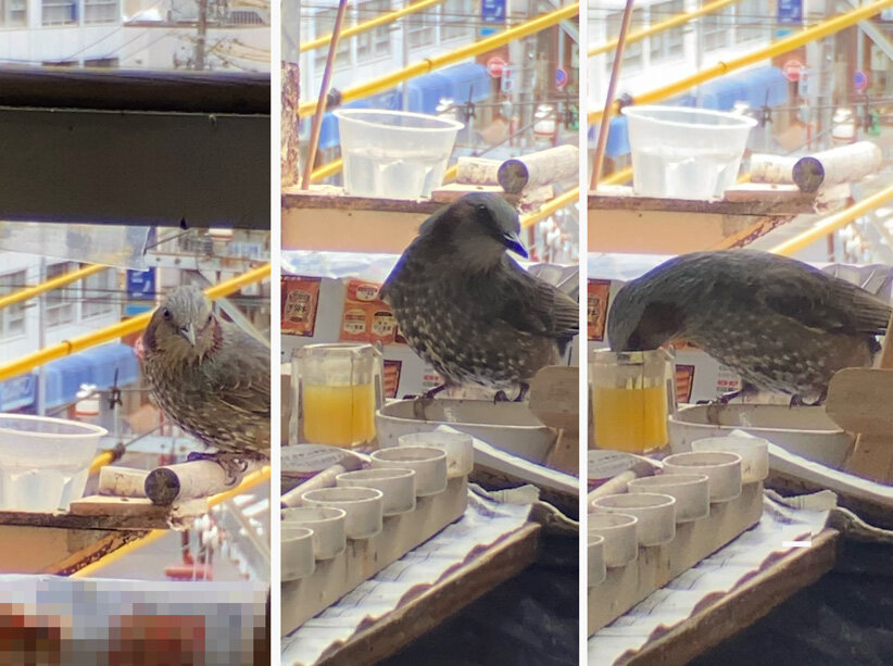 最初水飲み場で見かけたときは「ピーター」と呼びかけてしまいましたが上の段にはとまらないで入って来たのでニコとわかりました。ひとりで帰ってきたのか?かみさんは一緒か?ピーターとは別行動