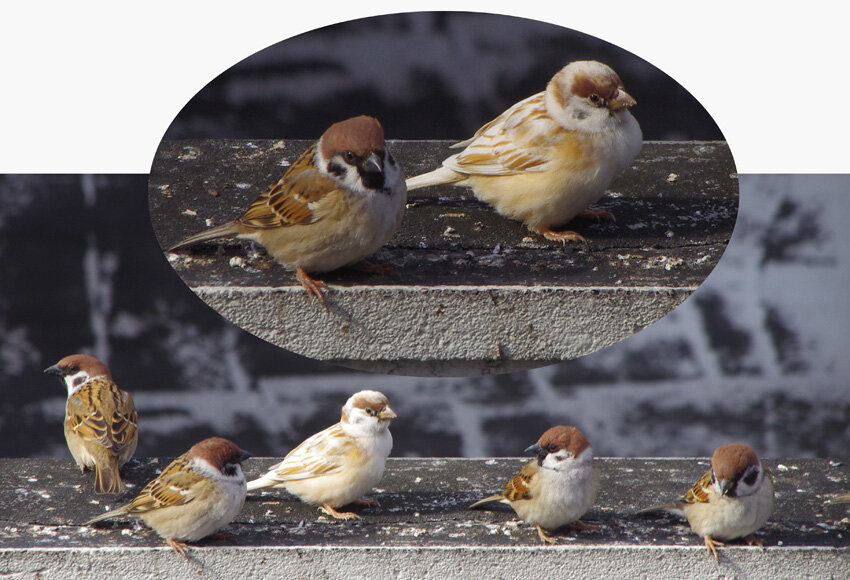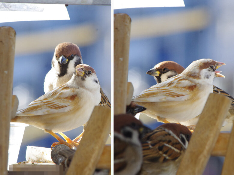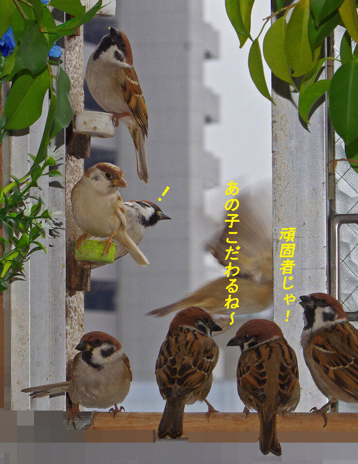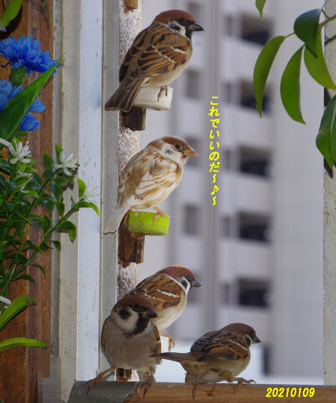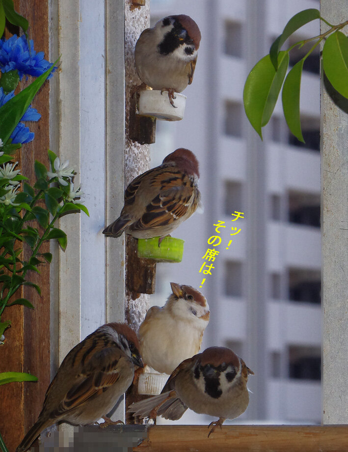 1月はチョウゲンボウの襲来があるのでスズメ達は見張り台で警戒します…「みんなしっかり見張るのだよ」いつも同じような写真になるね。