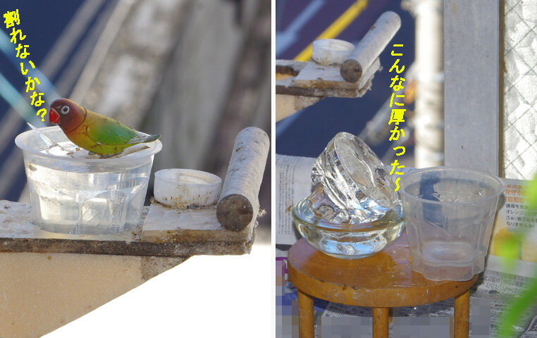 寒い朝でした。窓のプッチンプリンの器の水が凍っていました。どおせ薄いだろうとミニポッチ君を載せてみましたがびくともしません。プリンケースのほとんど凍っていました。名古屋では年に1~2度あるかないかです。昼間でも-3度です。