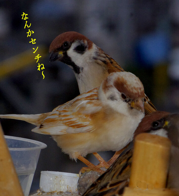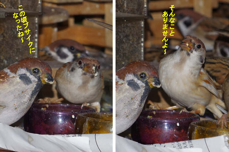 お昼に戻ると行列はいつものこと、大騒ぎで食べていきました。スズメ達も食べ物が少ないようですが寒さには負けませんね。ブッチーさんも何とかついて行っているようね~。