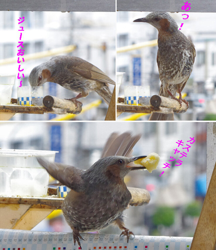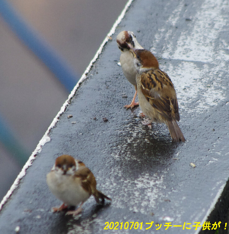 ブッチーさんは今日は普通に来て食べては飛び出していく。なんか行動が変なので気をつけていたら隣のビル縁で子供にエサをあげている。