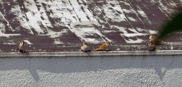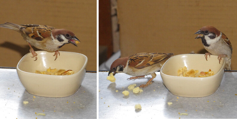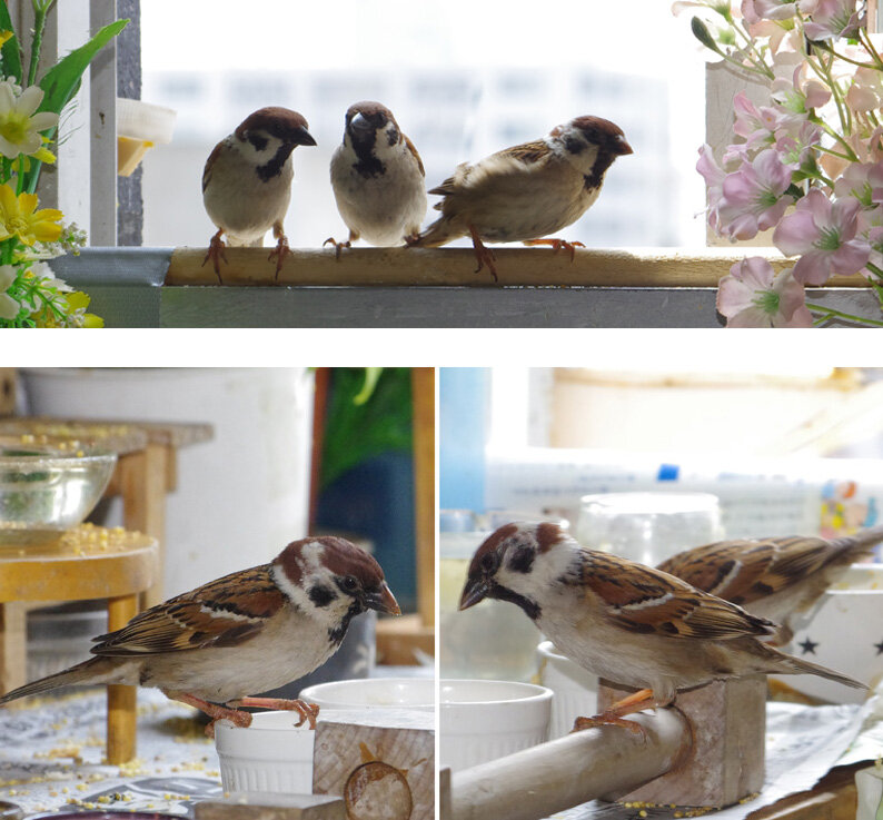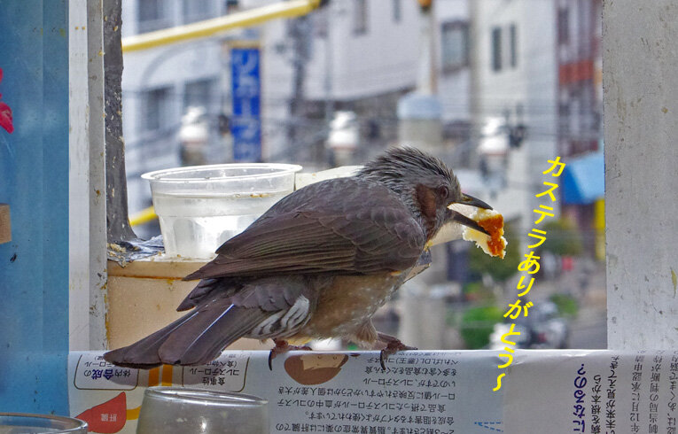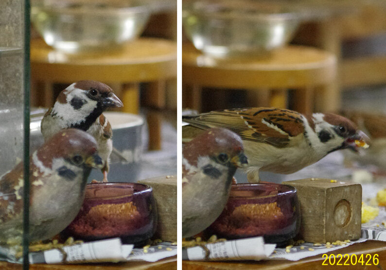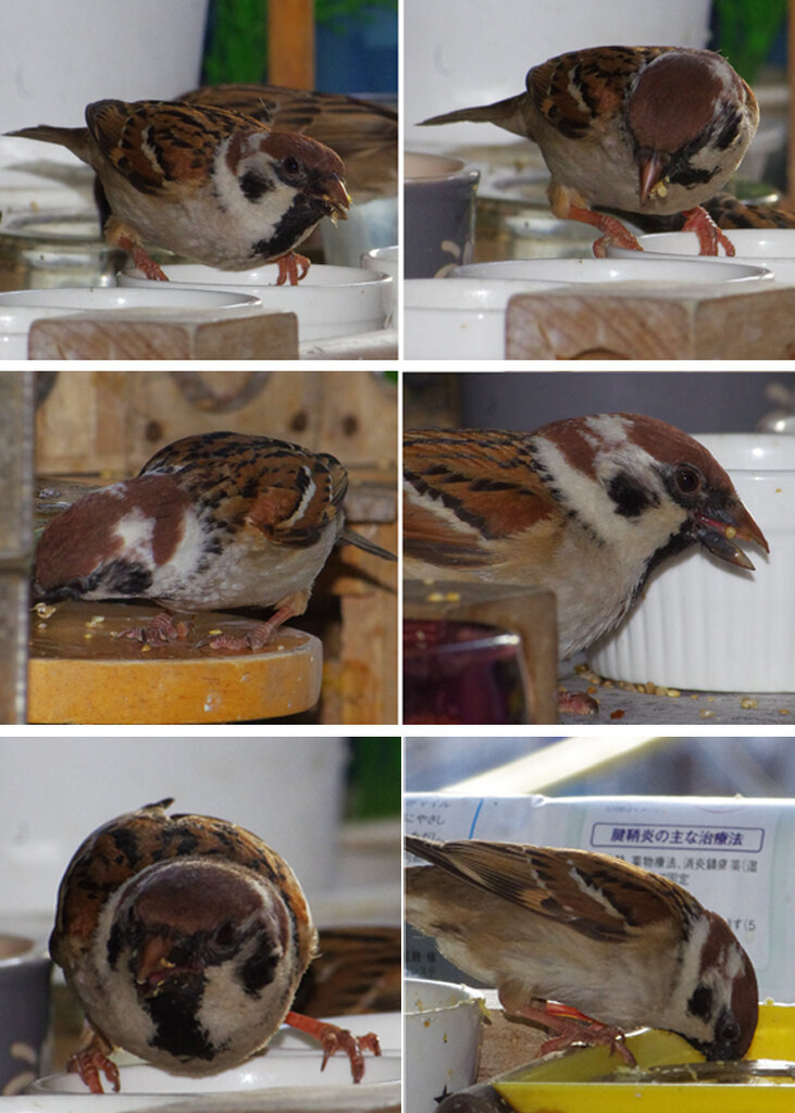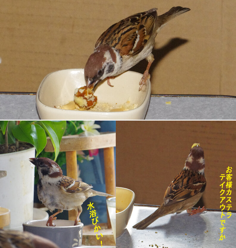 カステラを投げるとくわえて帰ります。この繰り返しが何回あったことだろう。去年は一回目の子育てはカラスに襲われて(多分)失敗。ひどく荒れていたね、二回目の7月にやっと3羽育てあげたね…だから今年は絶対失敗しないぞと必死なのね。でも実は水浴びしたからこんなにぬれているの。他のスズメはこんなに濡れてないし…。