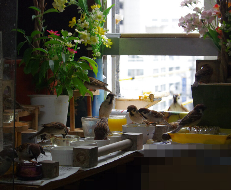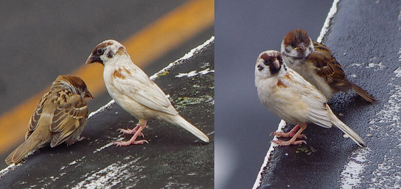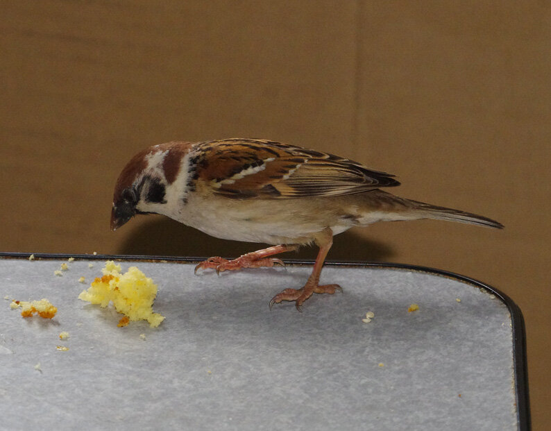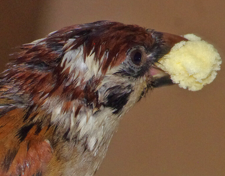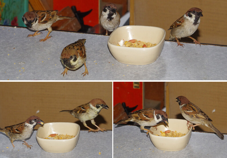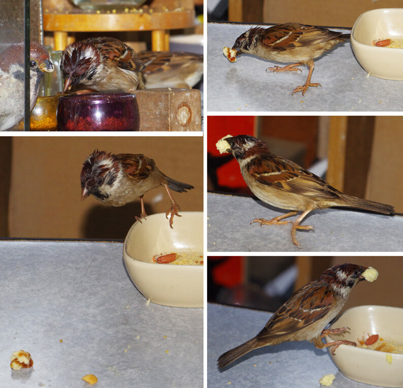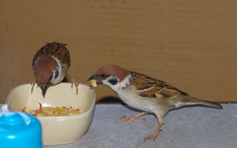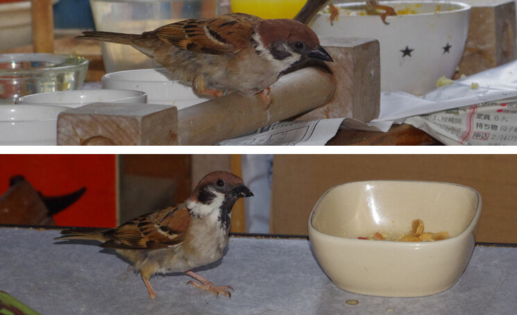 カステラを投げるとくわえて帰ります。この繰り返しが何回あったことだろう。去年は一回目の子育てはカラスに襲われて(多分)失敗。ひどく荒れていたね、二回目の7月にやっと3羽育てあげたね…だから今年は絶対失敗しないぞと必死なのね。でも実は水浴びしたからこんなにぬれているの。他のスズメはこんなに濡れてないし…。