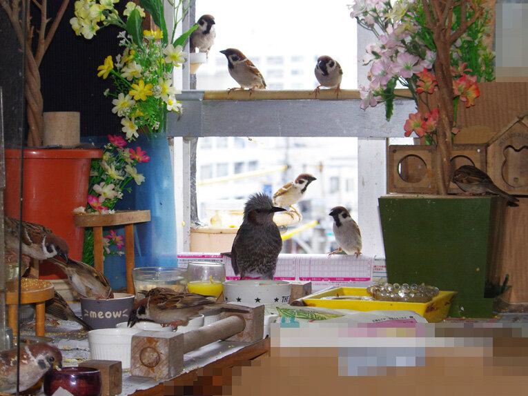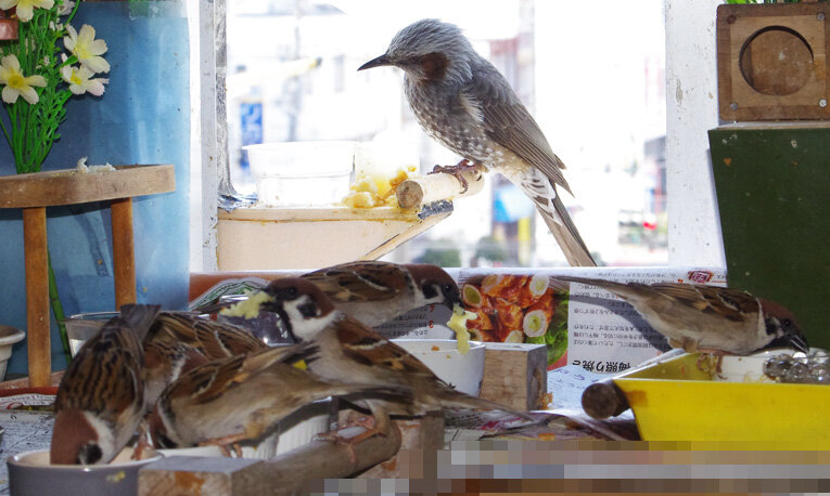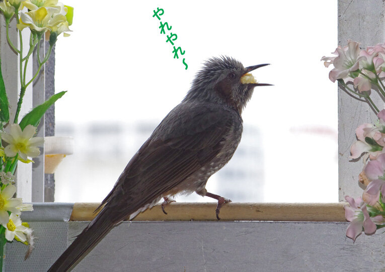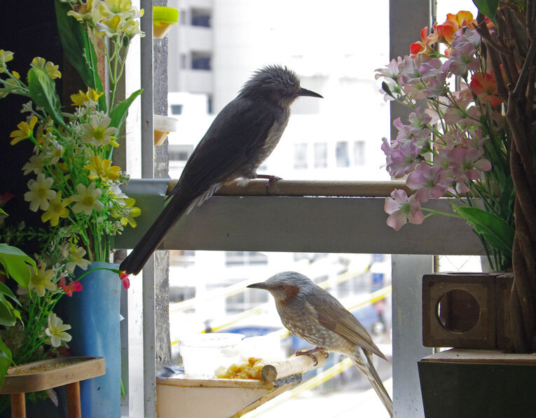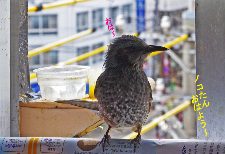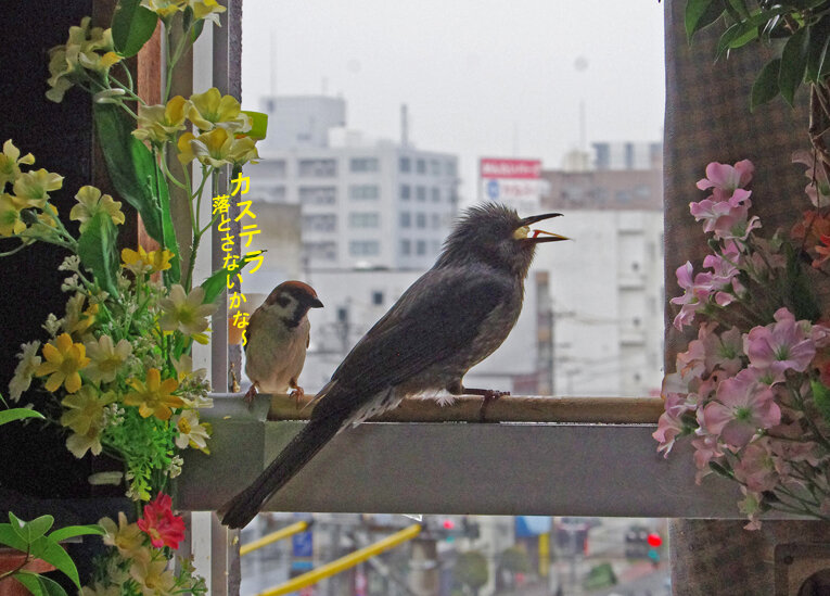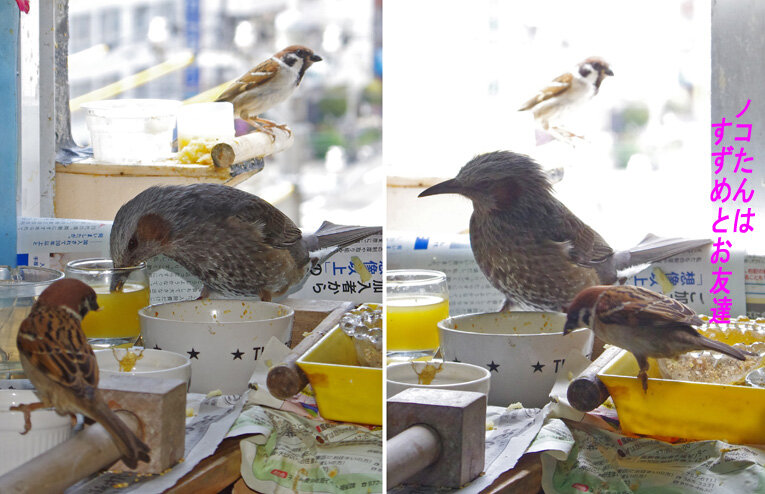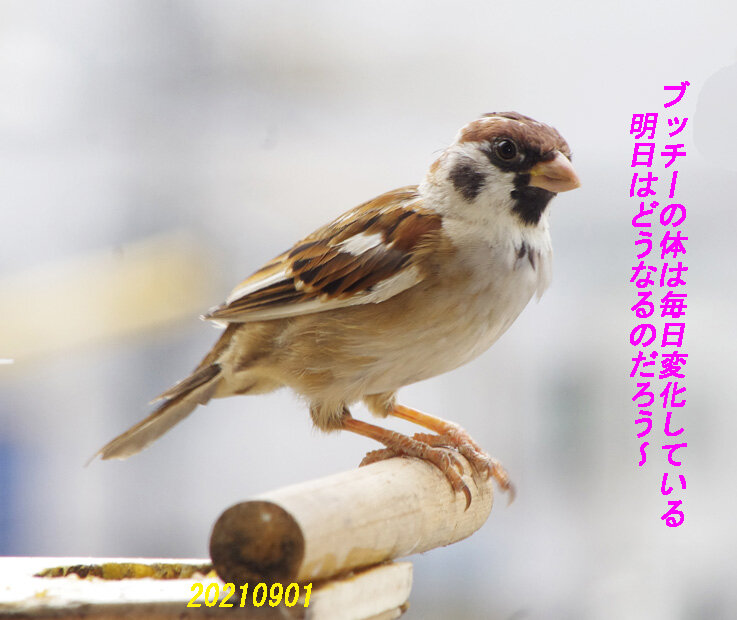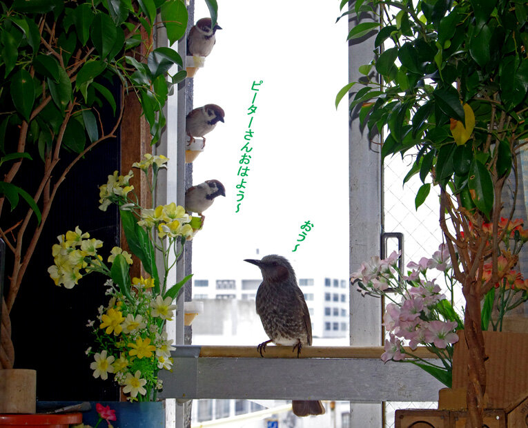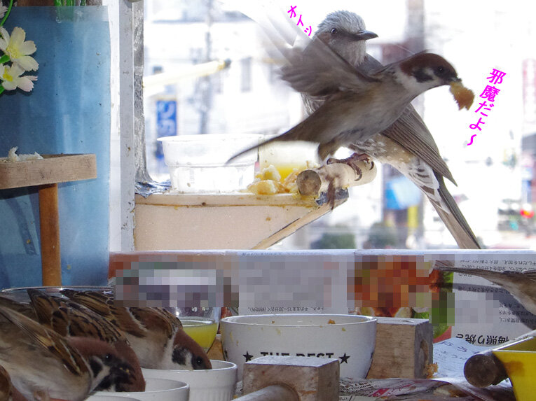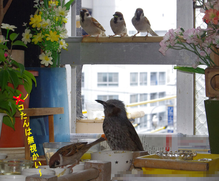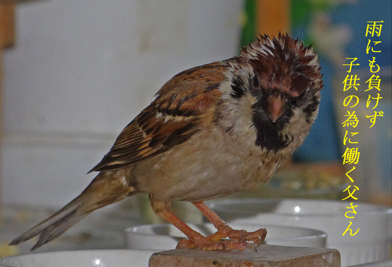 産卵期のスズメ達は雨が降ろうが風が強かろうがかみさんは「食べ物もってこい!」と厳しいからお父さん達は必至です。ブッチーさんは普段は「マスターベタベタしないで!」とエコひいきを嫌がって冷たい態度ですがこの時期はそうは言っていられません。