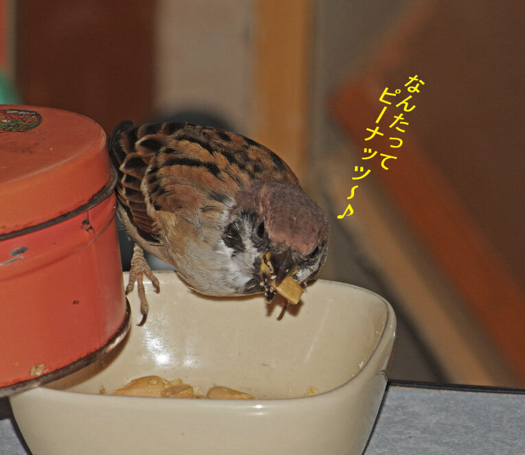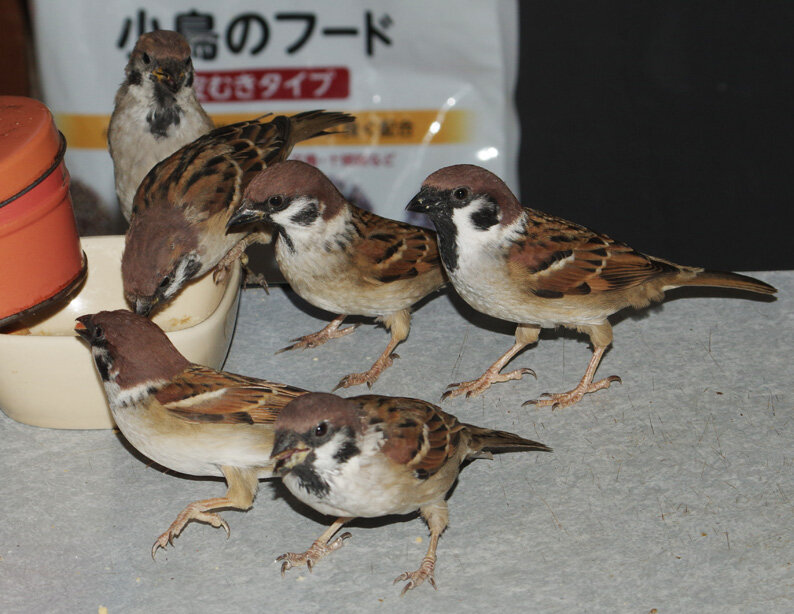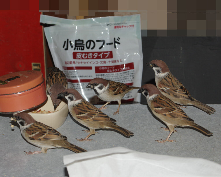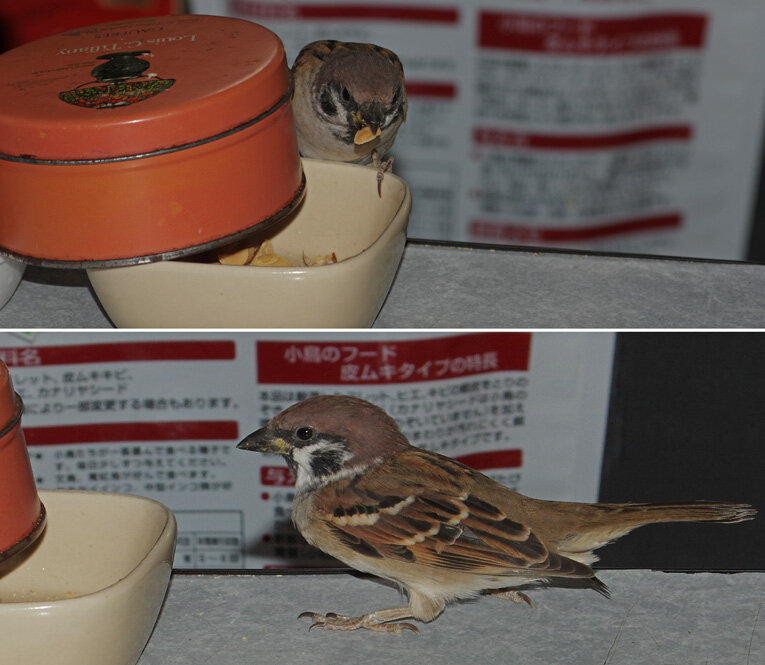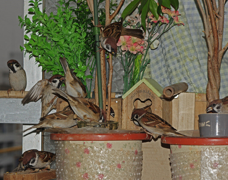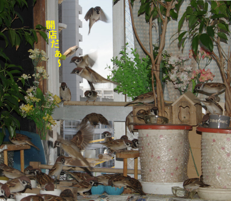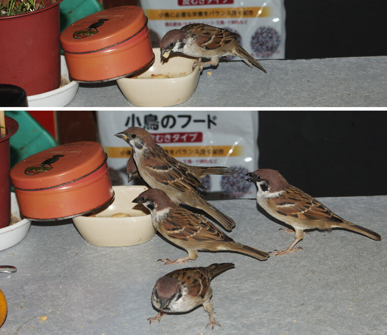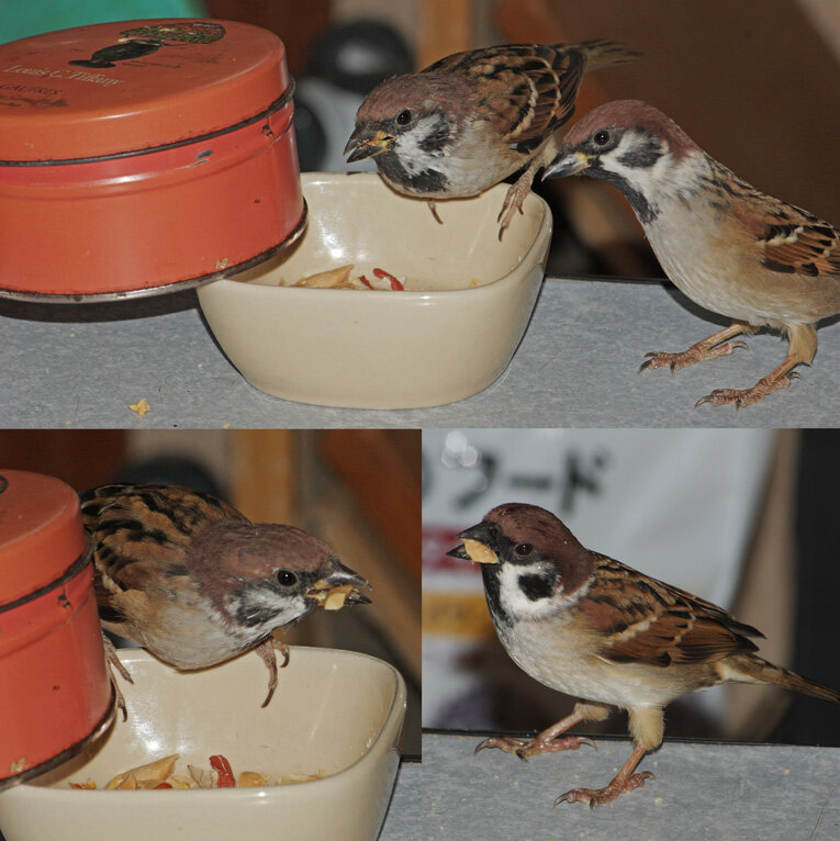 このところ比較的気温が高いし雨も降らない。スズメ達の冬越しの準備にはいいのかもね。河川敷や田んぼの食べ物も少なくなってきたのか遠征から戻るのが早めになってきた。開店すると物凄い勢いで入ってくる。