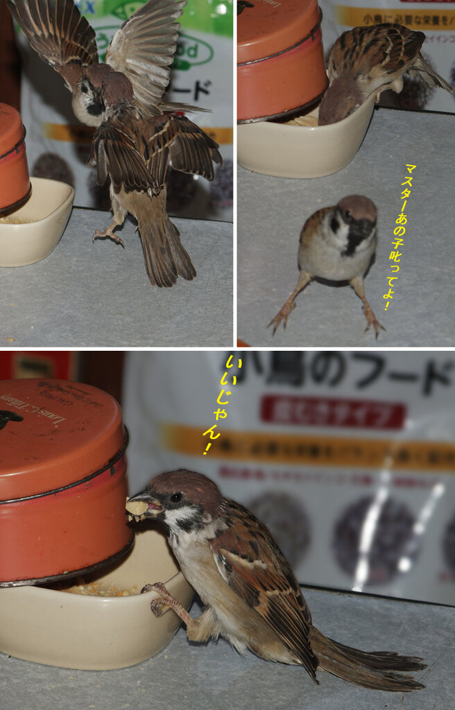 この年コピー君が戻ってきた時には先にヒヨチビさん(♀)が来ていて争いになぅた「マスターここあたしの縄張りなのよね~変なおじさんが来て困るのよ」「なに!ここは先代のお父さんから俺様の縄張りだい!生意気な小娘め」と睨みあいで今にも格闘戦になりそうな雰囲気が毎日続いた…