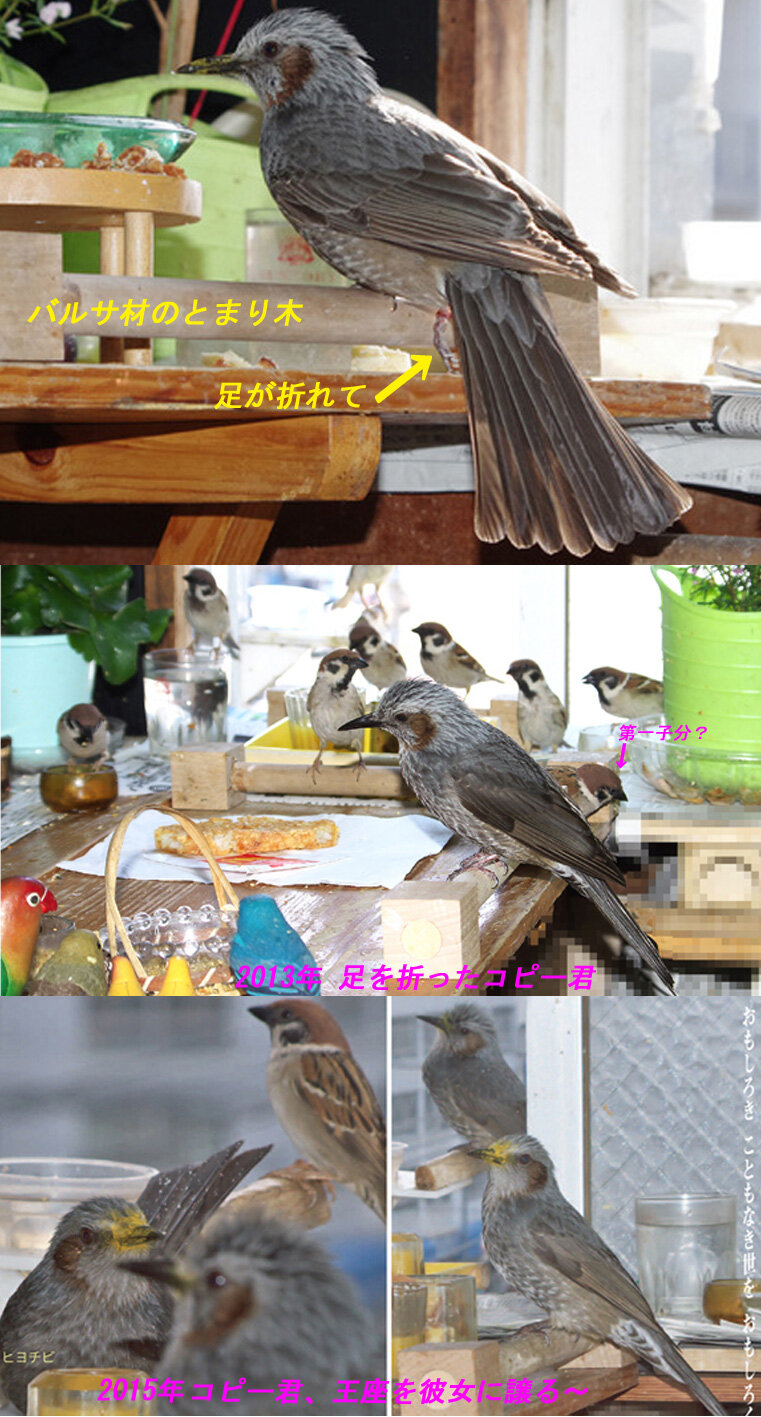 ヒヨドリの王の2代目はピーサンの子供のコピー君。彼はある時喧嘩なのか事故なのかわからないが左足を骨折してブラブラになっていた。とまり木にとまるのも痛そうで困っていたのでバルサ材で専用のとまり木の王座を作った。彼はそっと足を乗せてみて「イテッ」と顔をしかめたが柔らかいバルサ材なので気にいったようだった。