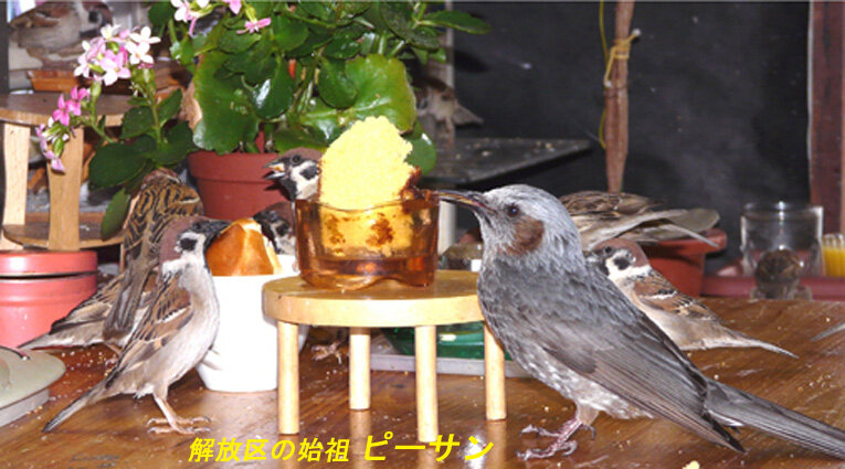 解放区の始祖ヒヨドリのピーサンはスズメのセブンベイブスについて入ってきた迷いヒナでしたがやがて立派なリーダーになりました。8年間、かみさんも年上のグラマーさん、幼な妻のピーヨンそして生涯の最愛の妻ビジーさんと子供をたくさん作りました。最後の方は半年ぶりに帰ってくると「歳とったな~」「お前もな」とマスターと顔を見合わせて憎まれ口をたたいたものでした…とお互い感じたということですけどね。