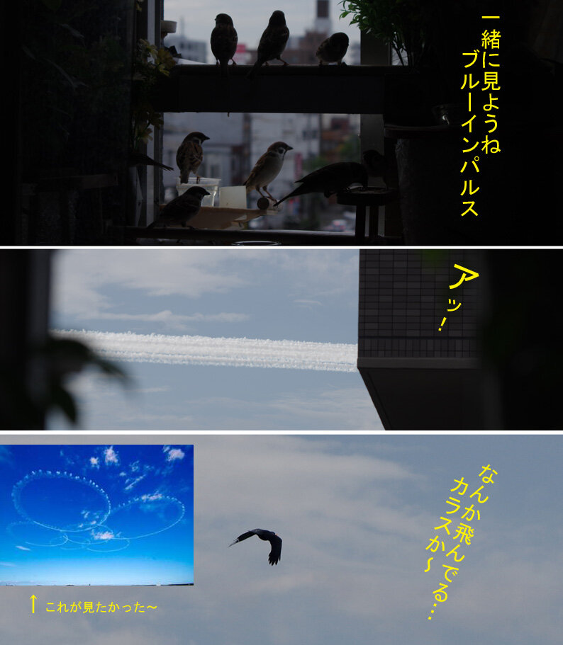 今日は愛知県政150周年の日記念だとかでブルーインパルスが上空を飛ぶのでスズメと一緒に見ようとカメラ構えて待っていたが一瞬通り過ぎる飛行機雲だけしか見られない。ビルが多くなって空はあまり見えないね。昨日の予行練習は晴上った青空で外で見えたけどね。航空祭とかで写真はたくさん撮っているけどいつ見てもなんか嬉しいものですね。