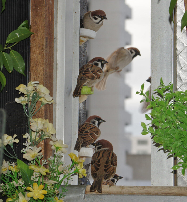 穏やかに開けました。スズメ達は元気にお正月を迎えました。向かいのビル縁に並んでご挨拶。もっと右側にもいるのですが入りませんでしたね。