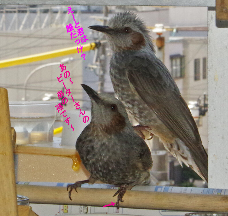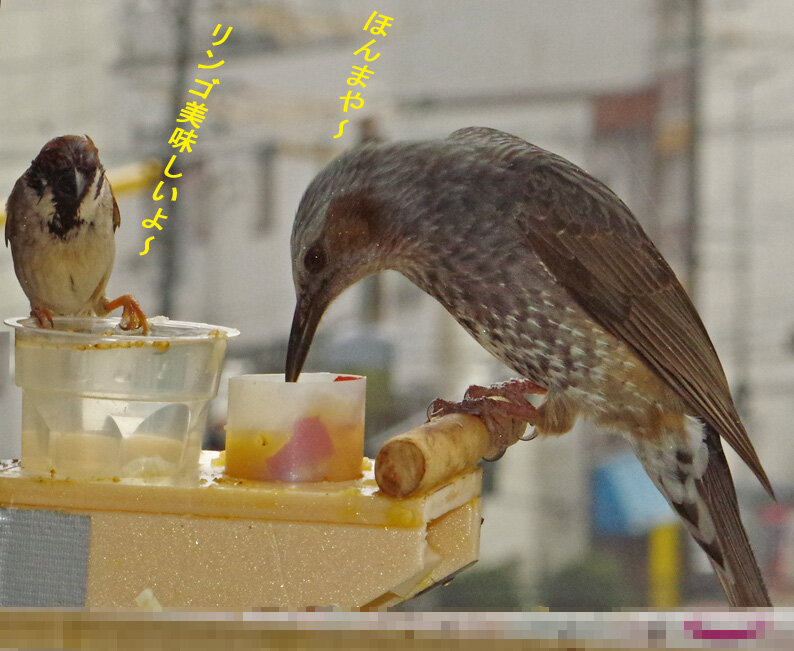 ヒヨドリのオスはこの二人だけ。後は目を合わせると逃げていく誰か。女子は姉ちゃんは来ない。いもちゃんも来なくなった。末ちゃんらしい子は来ている。女子は彼氏ができるとついて行ってしまうからね~。お嫁に行っちゃったという感じね。