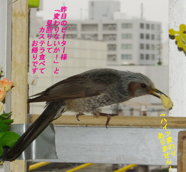 春爛漫の天気にスズメもヒヨドリもデートに忙しいのかも。お昼のランチも数が減りました。安食堂のメニューにも飽きたようです。飛び込んでくると「何はなくともピーナッツ」と言っていた連中もピーナッツは無視、夕方にやっとなくなる程度です。なかにはジッジッ!と大きな声で怒りながら飛び込んできて食べてまた飛び出していく子は…彼女に振られたとか喧嘩で負けたのか…がんばってね~と応援したくなりますね。