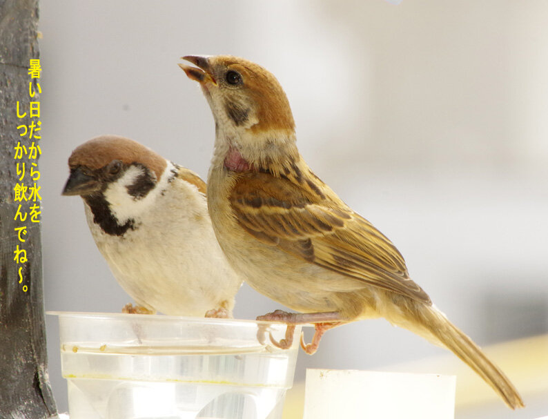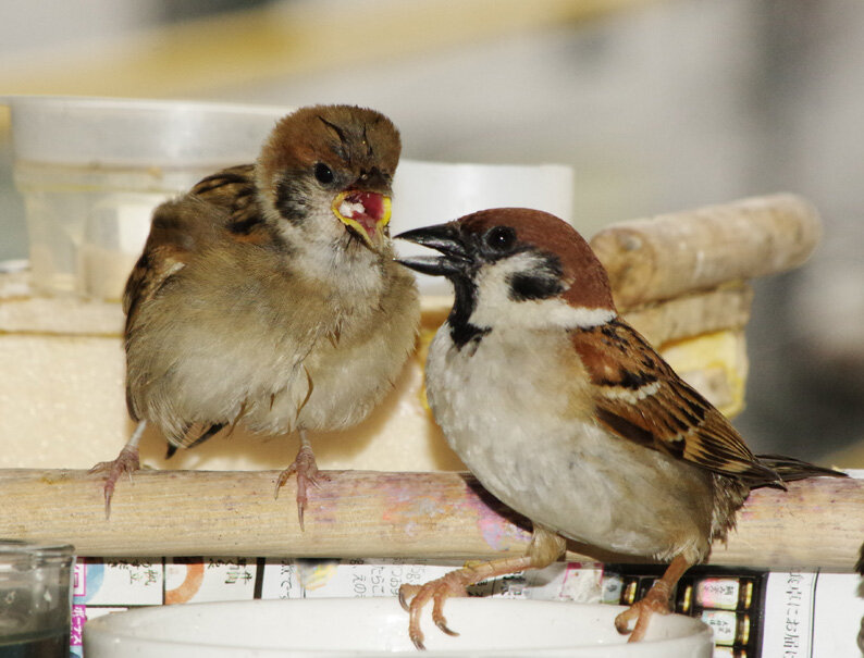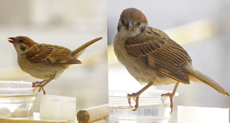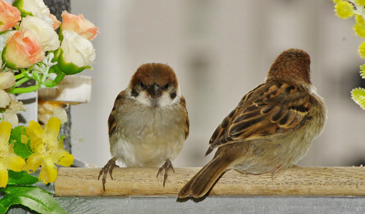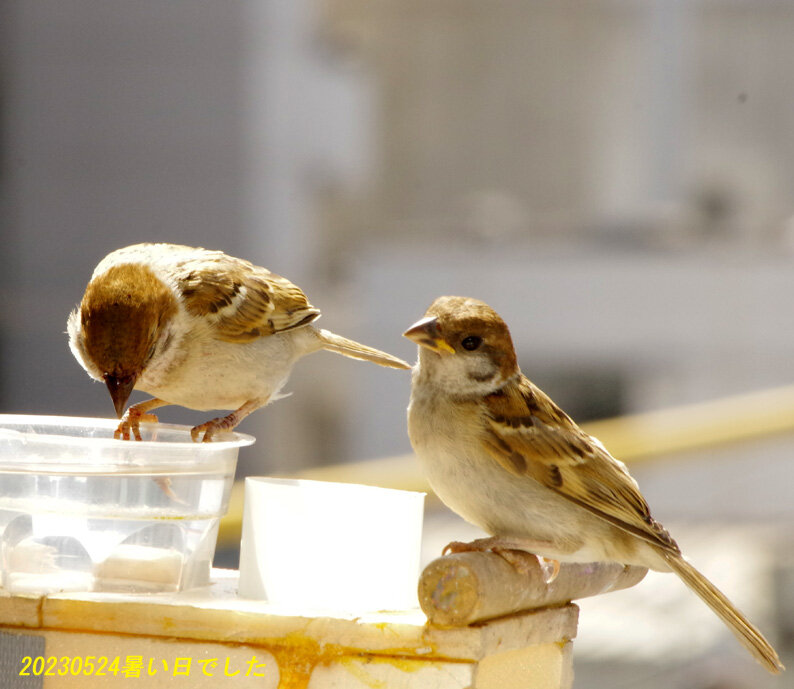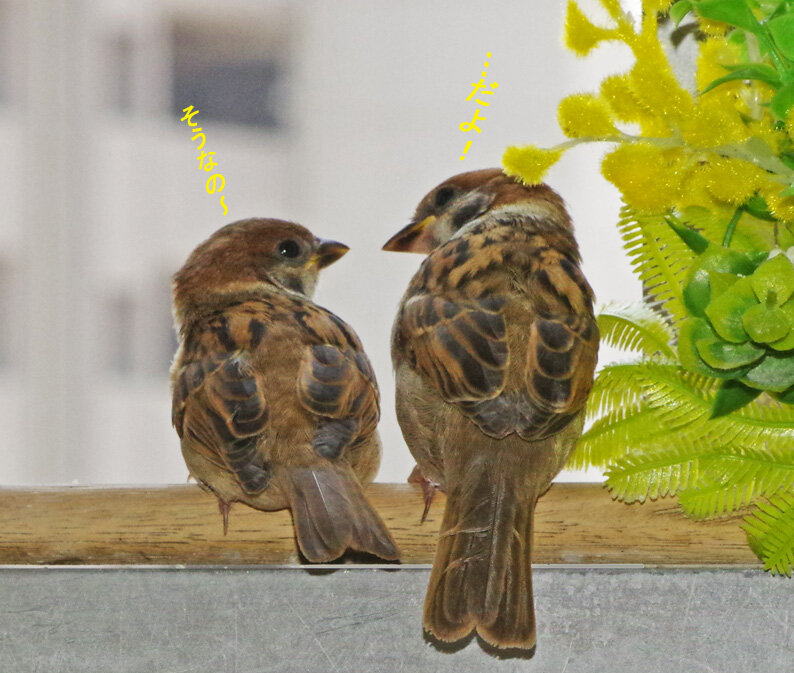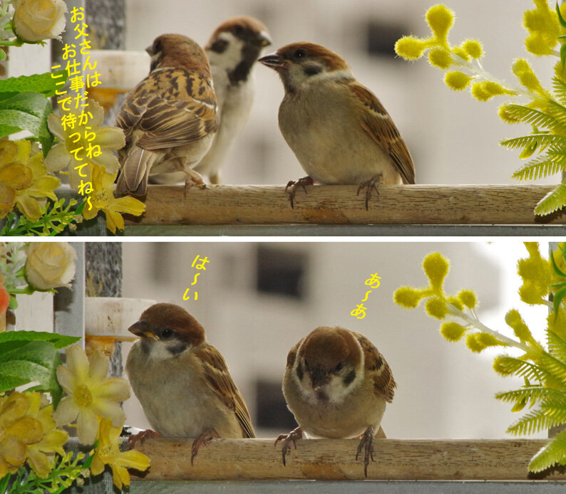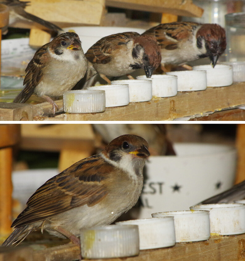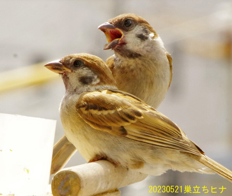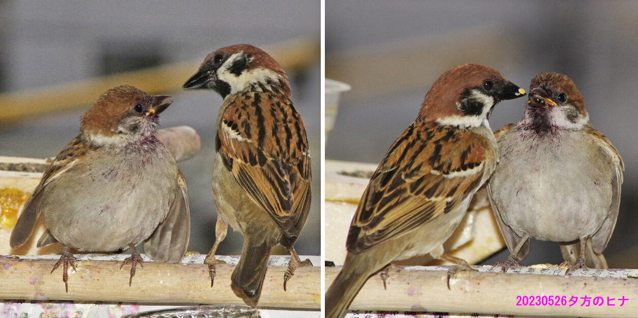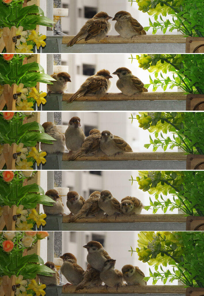 スズメのヒナはお父さんを追いかけて泣いていたのに翌日はもうひとりで食べて仲間と一緒にいる。