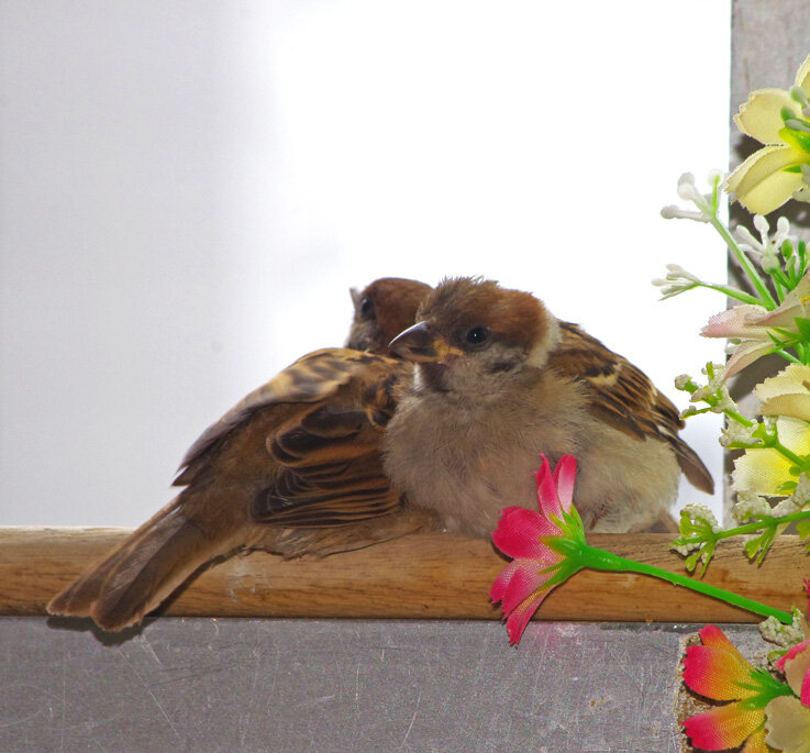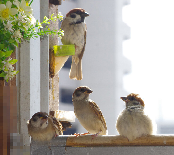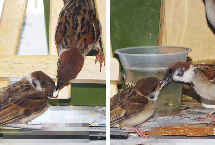 お父さんは保育園に預けて虫捕りのお仕事に行ってしまうからお昼寝しながら待っています。これが解放区にくるスズメの子育ての標準型ですが…