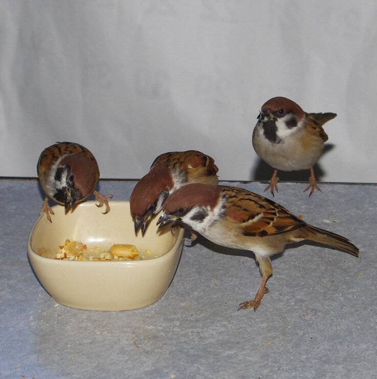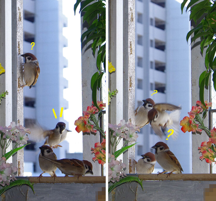お写真見てびっくり! 足場が無いのに、壁にへばりついてる雀達!!!