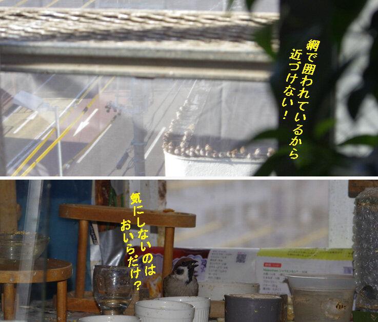工事は進んで足場の金属だけでなくビルのまわりを細かい目の網でかこわれてしまいました。お昼はみんな腹いっぱい食べられましたが夕方は遠巻きにして見ていました。これでは近寄れないね。強いリーダーの元しばらく耐えてね(;_;)。