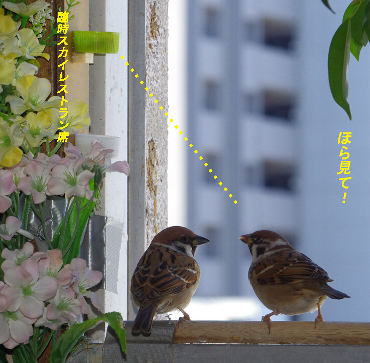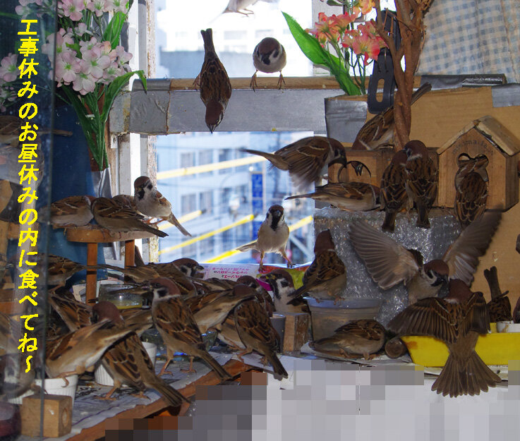 お昼休みに食べられる今日はまだいいけど。鉄パイプの足場はもう4階まで来ました。明日は窓まで来るからさてスズメ達は入られるだろうか?何とかうまくいくといいね~。