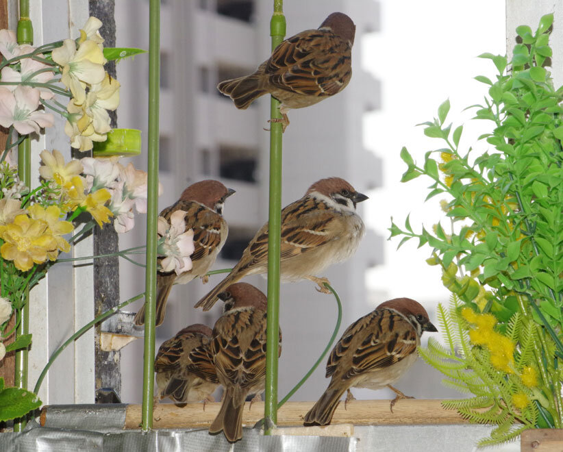 スズメたちは半分他所の子でなかな落ち着きません。ピーナッツ党はべテランの常連さんですから落ち着いたものです。
