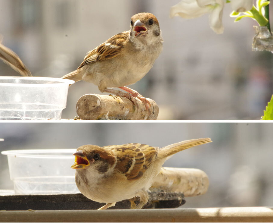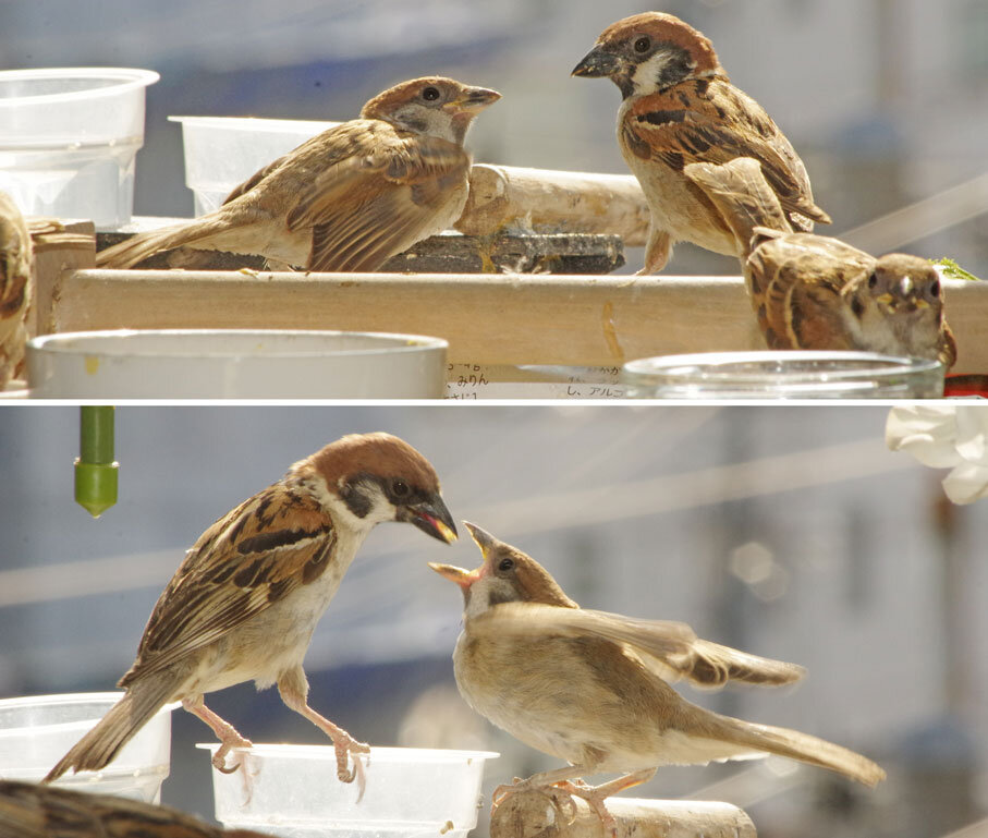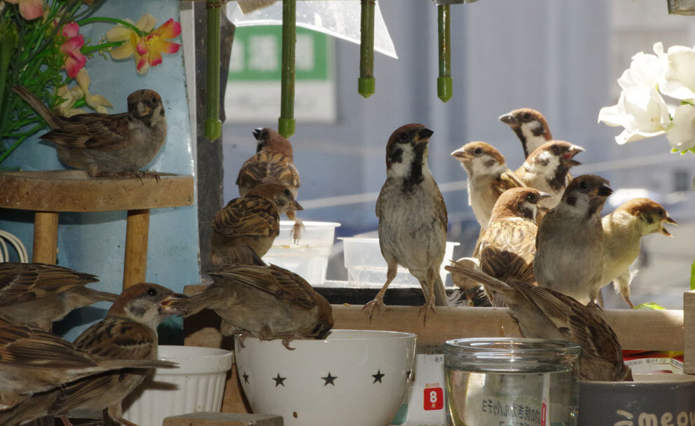 真夏ヒナも元気に頑張っています。午前中の河川敷遠征は幼い子は連れて行ってもらえません。午前中は換気のために窓を開けていますがそっとのぞいて「開店してますか?」と遠慮がちに入ってきます。窓際に少しだけ食べ物と水をおいてサービスしています。