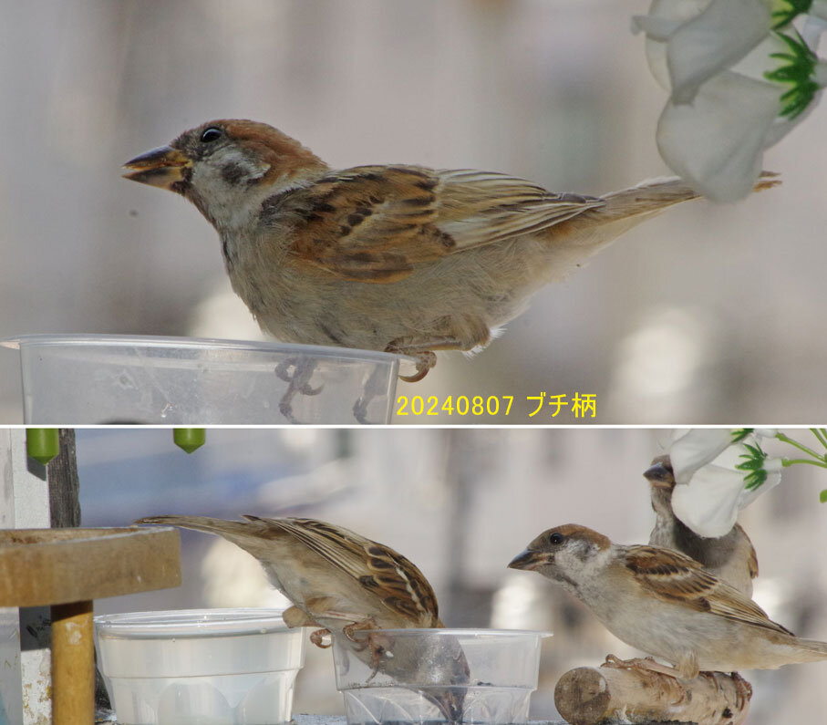 毎日酷暑が続きますね。かなりバテていますがスズメ達のことを思えばエアコンの前にいて文句は言えないね。ブチ柄君たちの2羽はかなり白くなったような…。