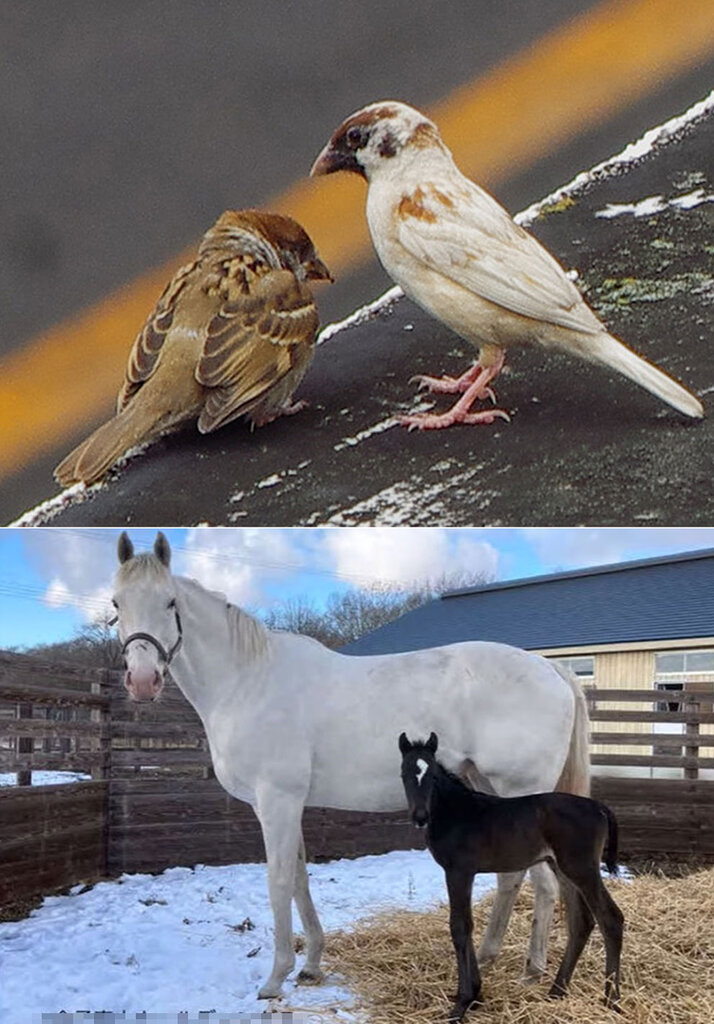 ソダシはイクイノックスとの子を産んだが子供は白くなかったね~。ブッチーさんの子供も普通のスズメ色だった。孫らしい子のシロッペ君は尾羽と後ろ側が白かったけど成鳥になると普通の色になってしまった…などなど。(なお、このソダシ親子の写真はネットから無断でお借りしたものですので消さなければいけないかも)