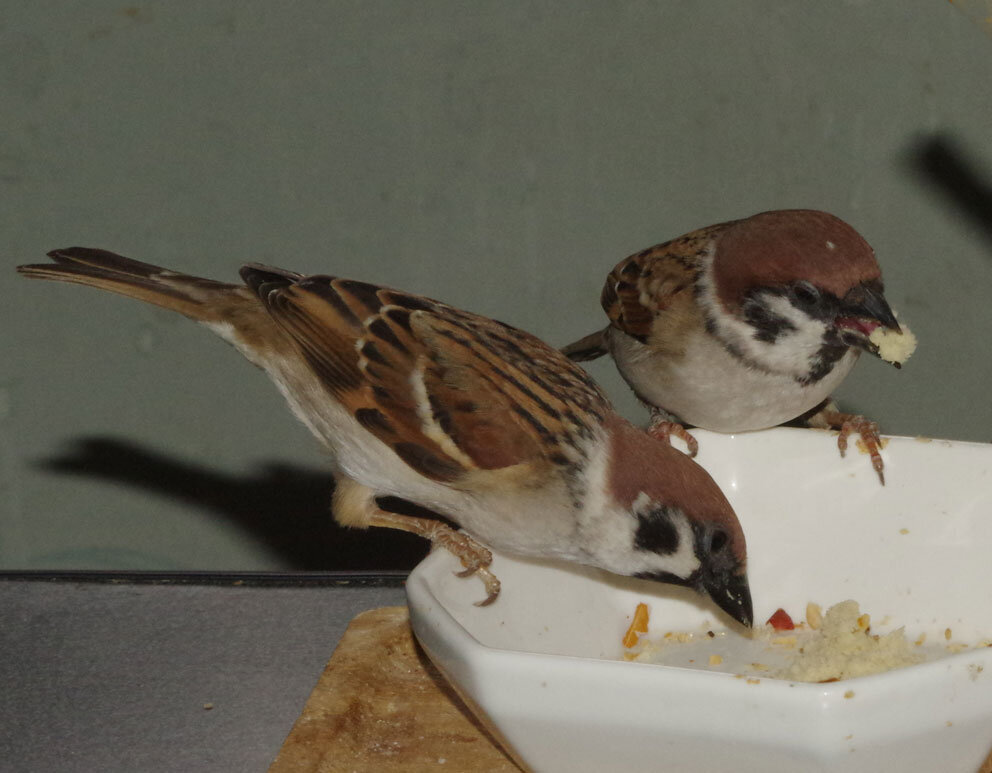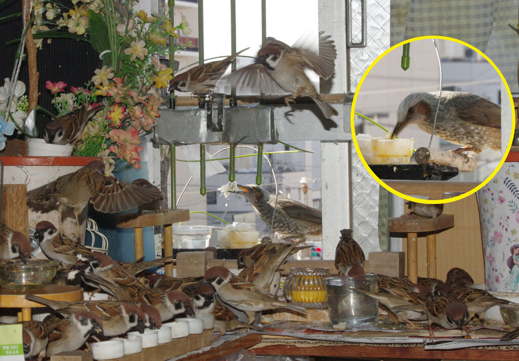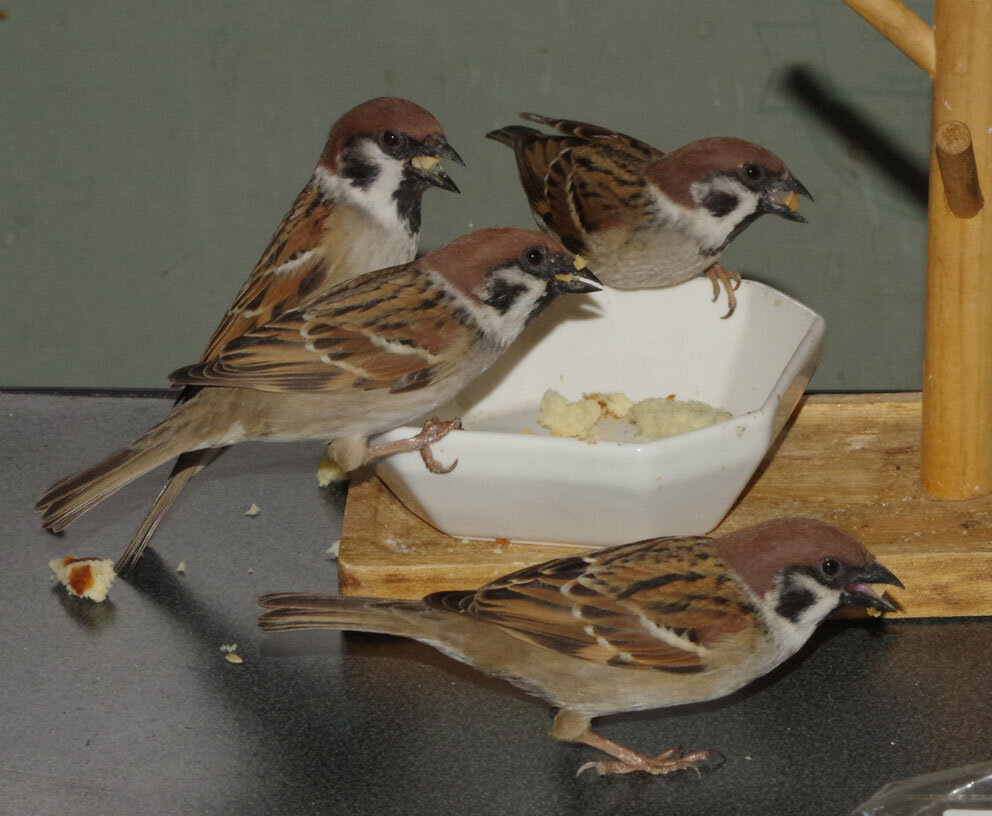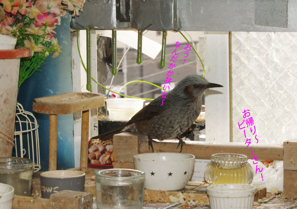毎日来ている若いヒヨドリたちはスズメには認められたのでピーターさんにうまく挨拶できるといいね。