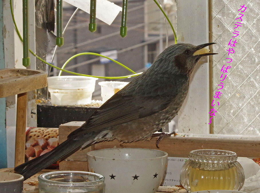 窓の外のスカイレストランは猛禽除けの針金だらけで食べにくい場所になってしまったが今日こちらをのぞいているヒヨドリがいた。
